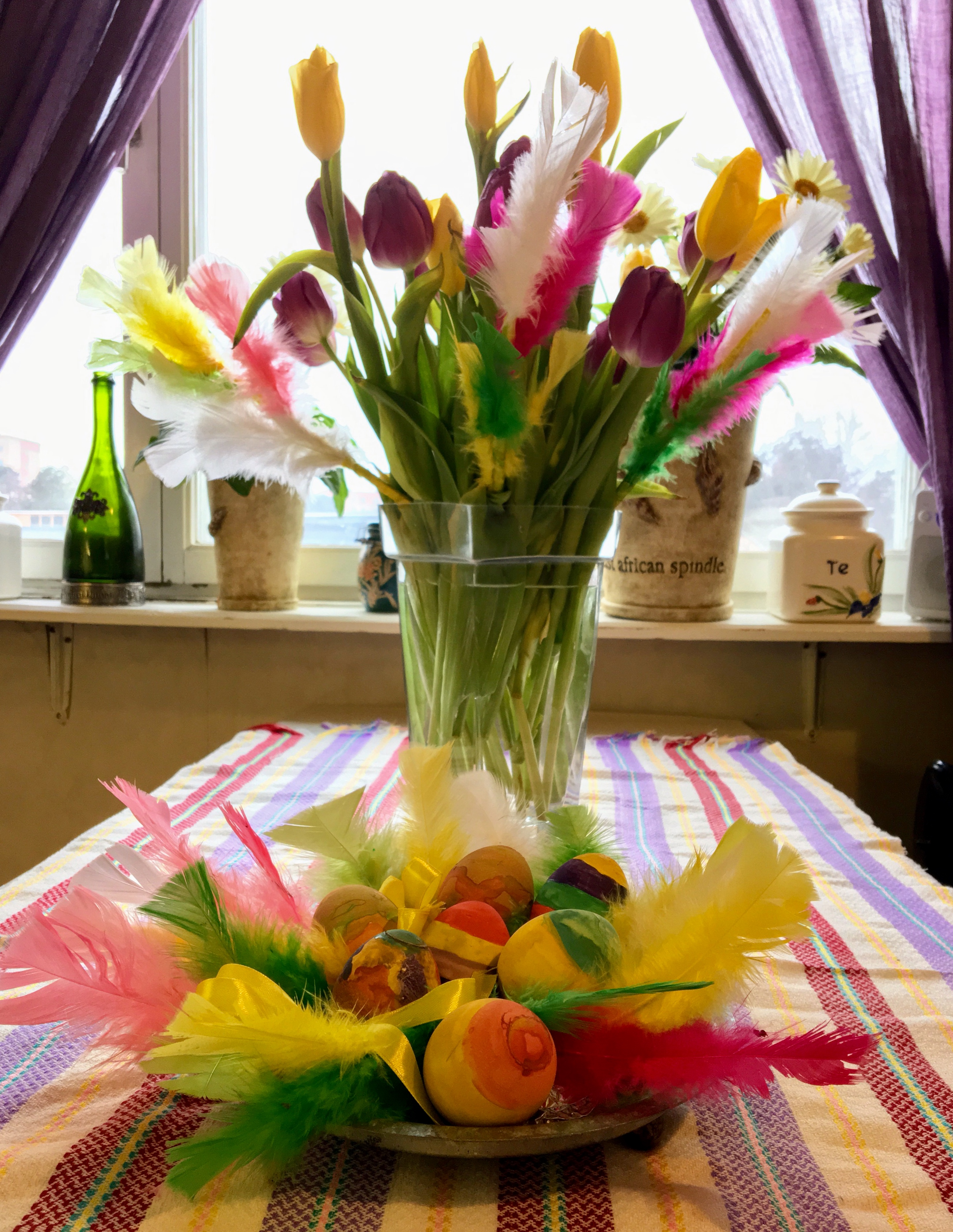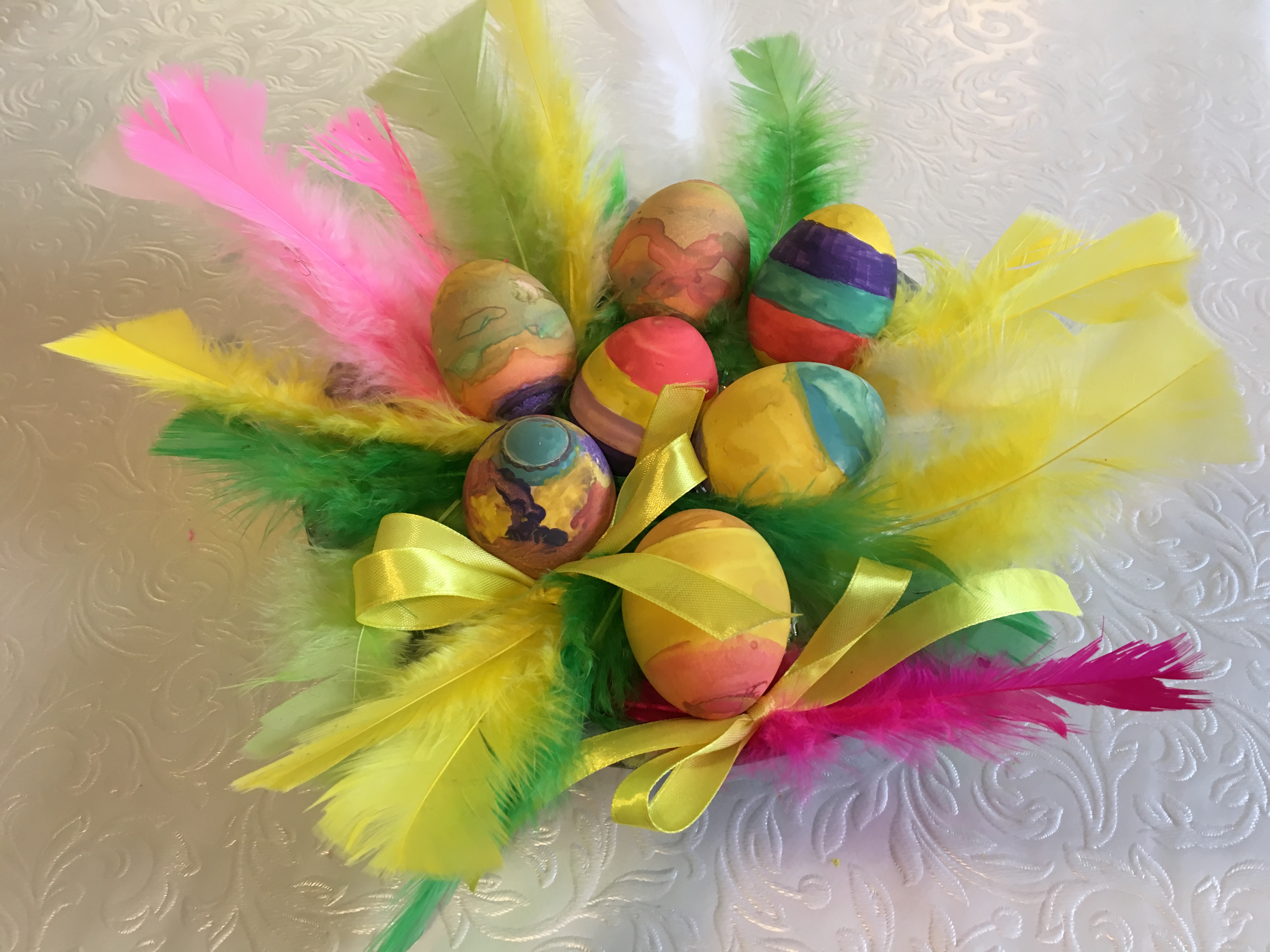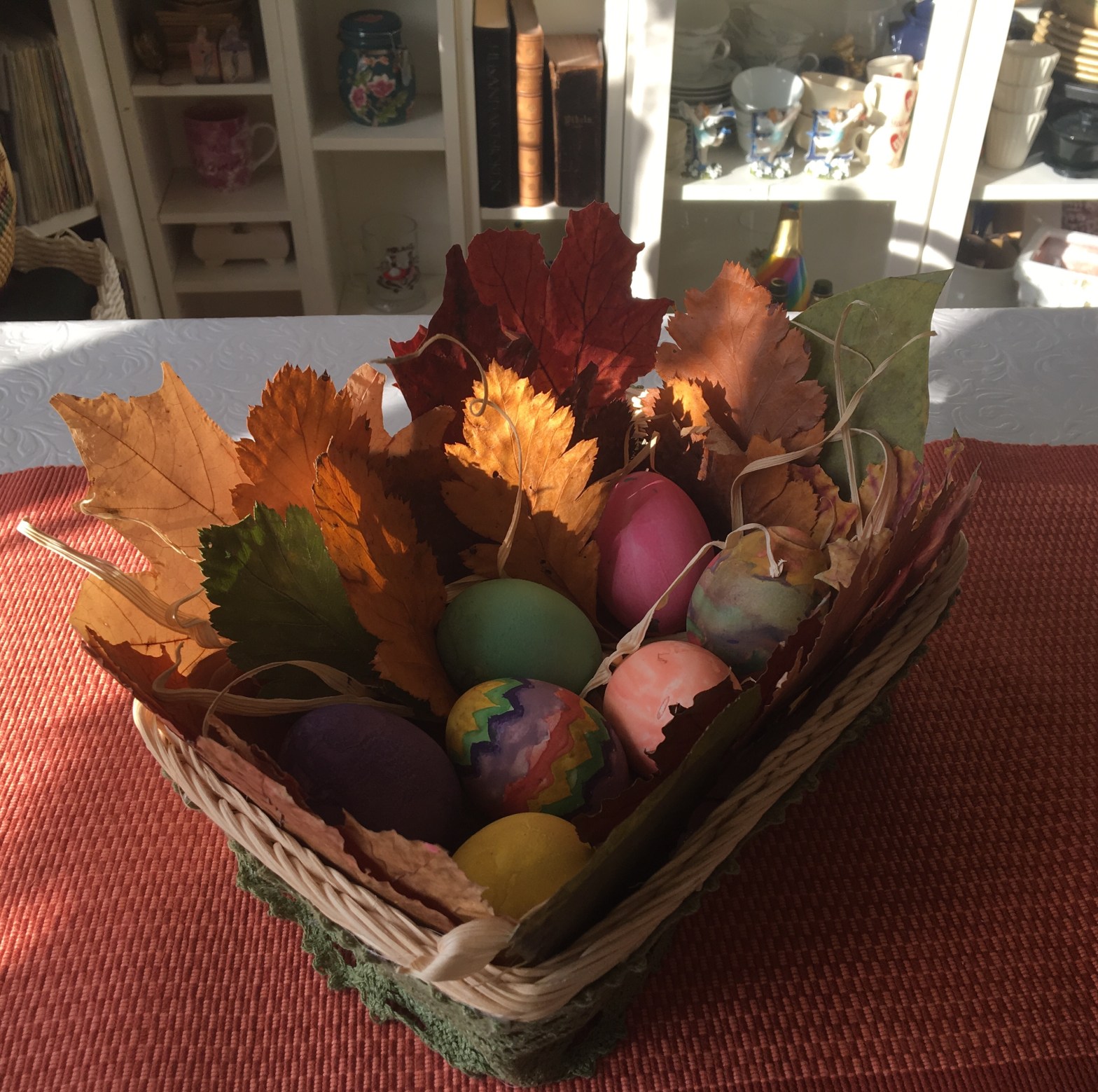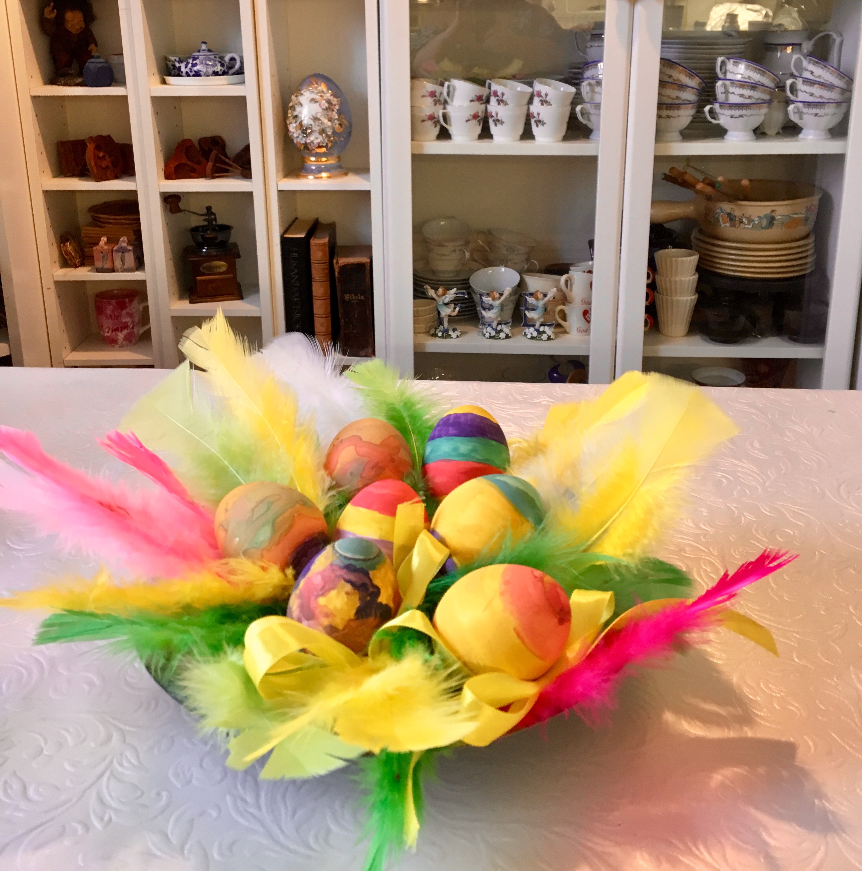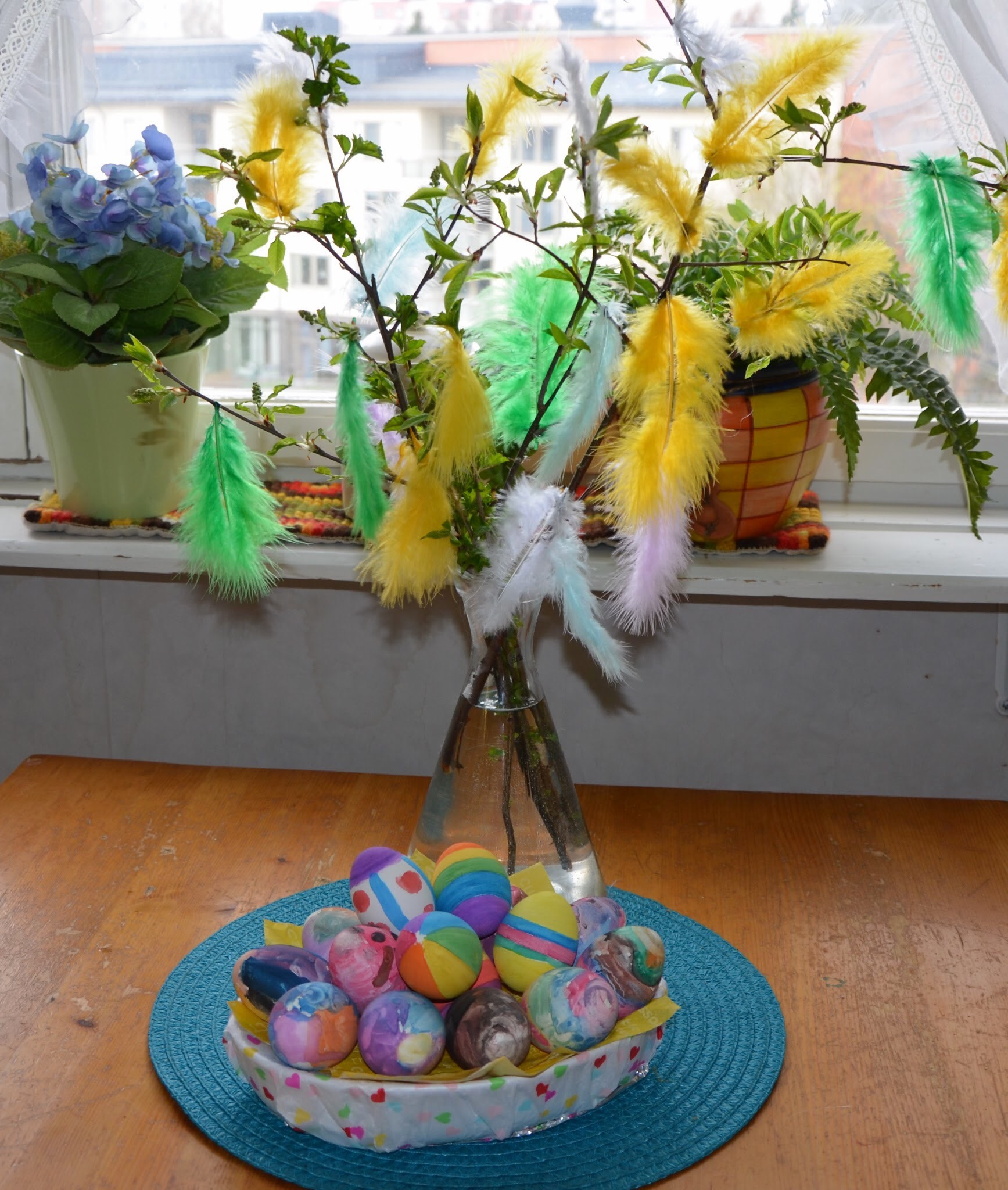 Eggs can also be colored with food coloring. Natural food colors can be made from purple cabbage, spinnach, onions, turmeric.