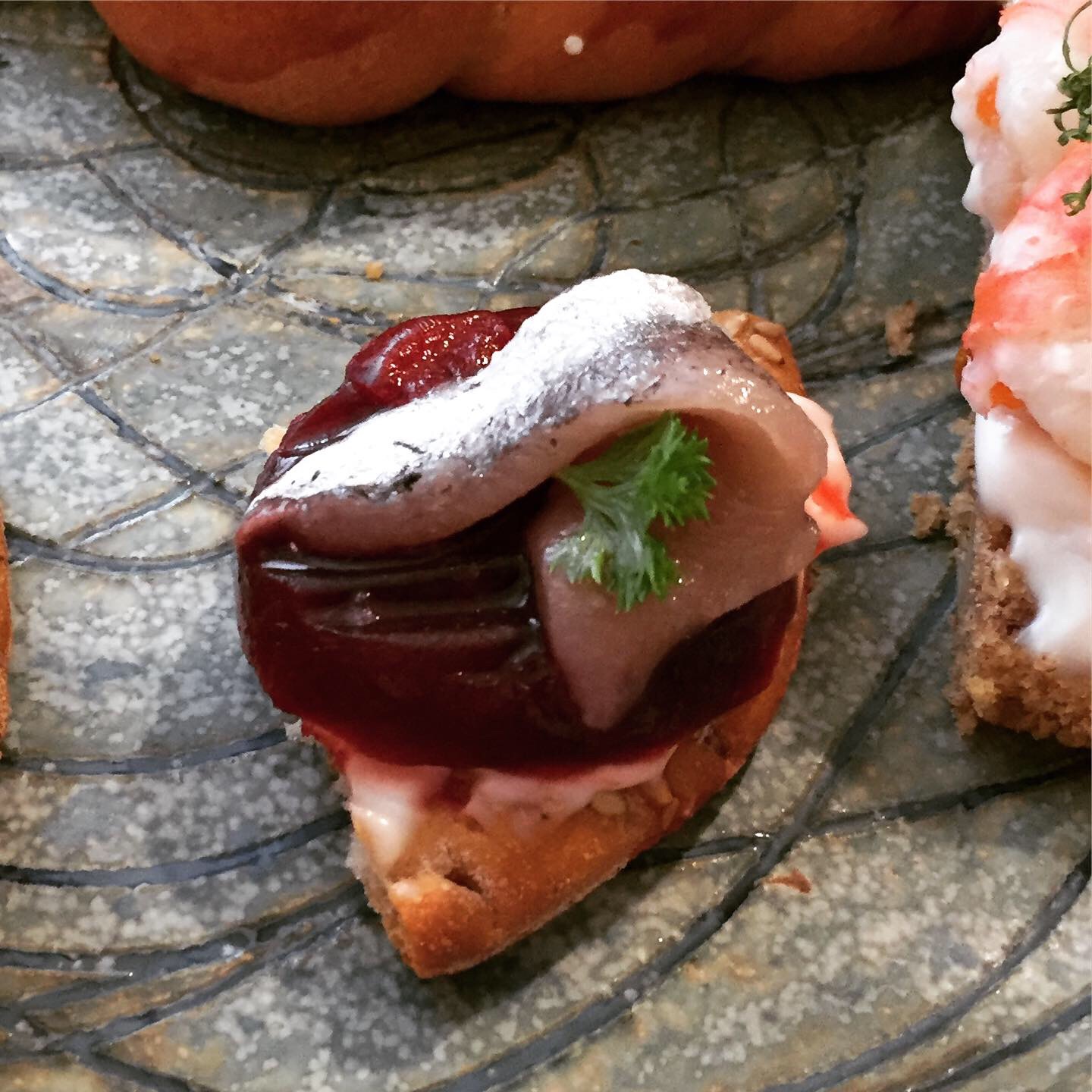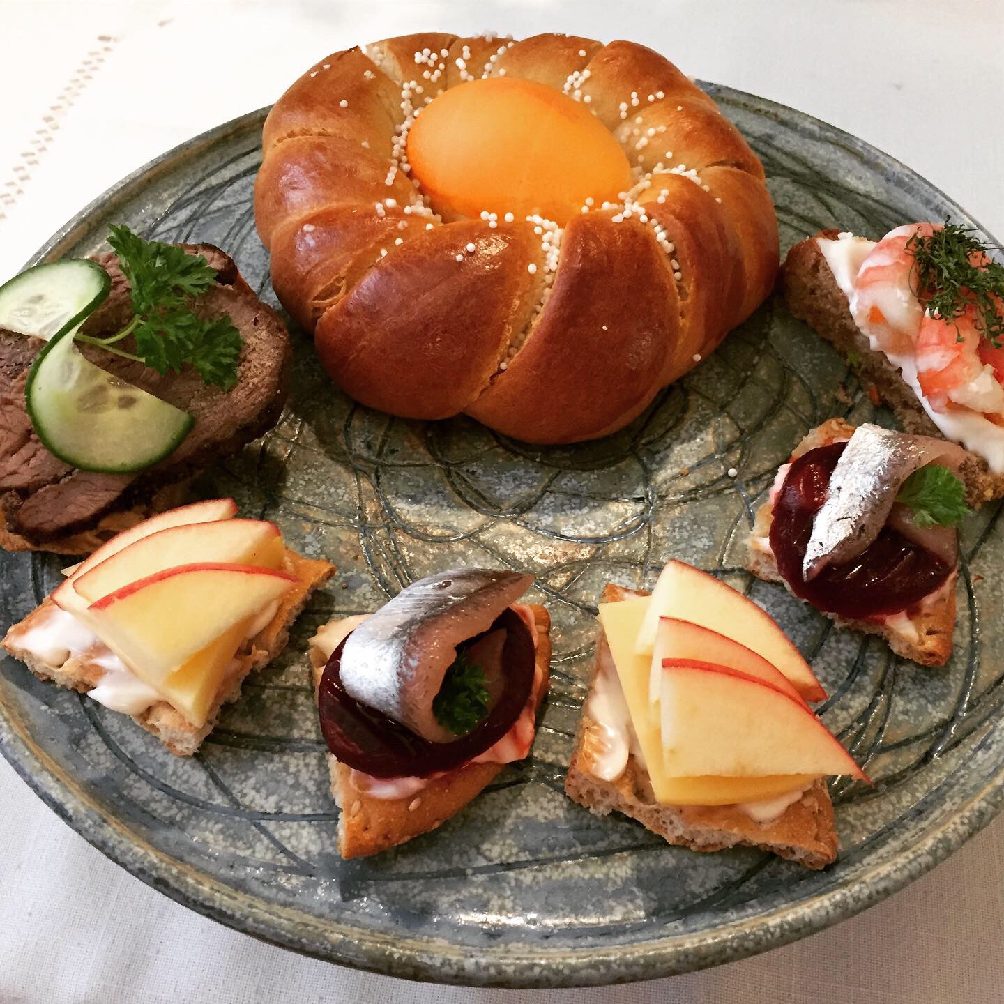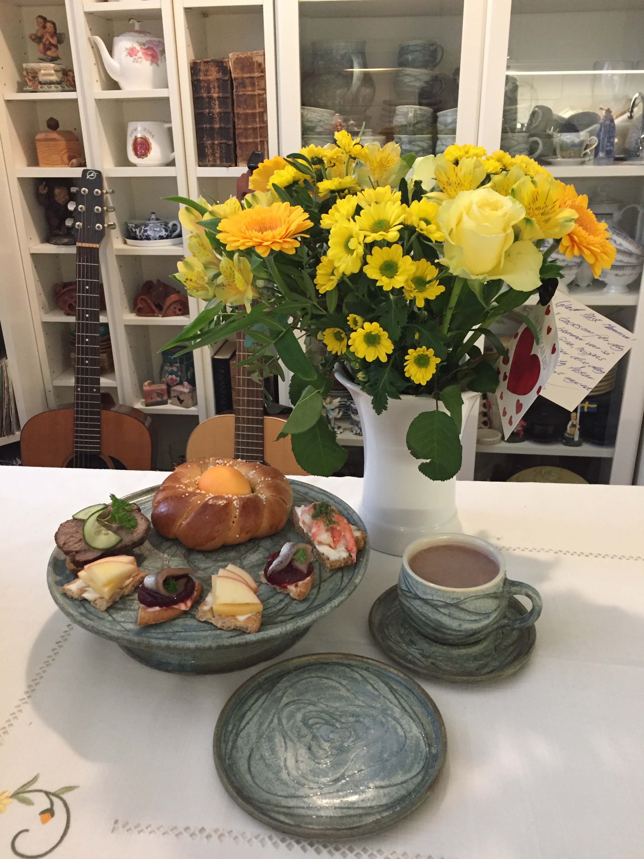 My Easterbrunch with a twist was some Swedish Smörgåsbord ingredients created as my own Afternoon Tea. Here I had bread, Egg, Herring, Beetroot, Lamm Roast Beef, Cheese, Apples, Shrimps. My drink was hot Chocolate. It was cold outside. The lovely bouquet of Easterflowers came from my daughter Frida with thoughts from Texas, USA. They lit up my heart and Easter.