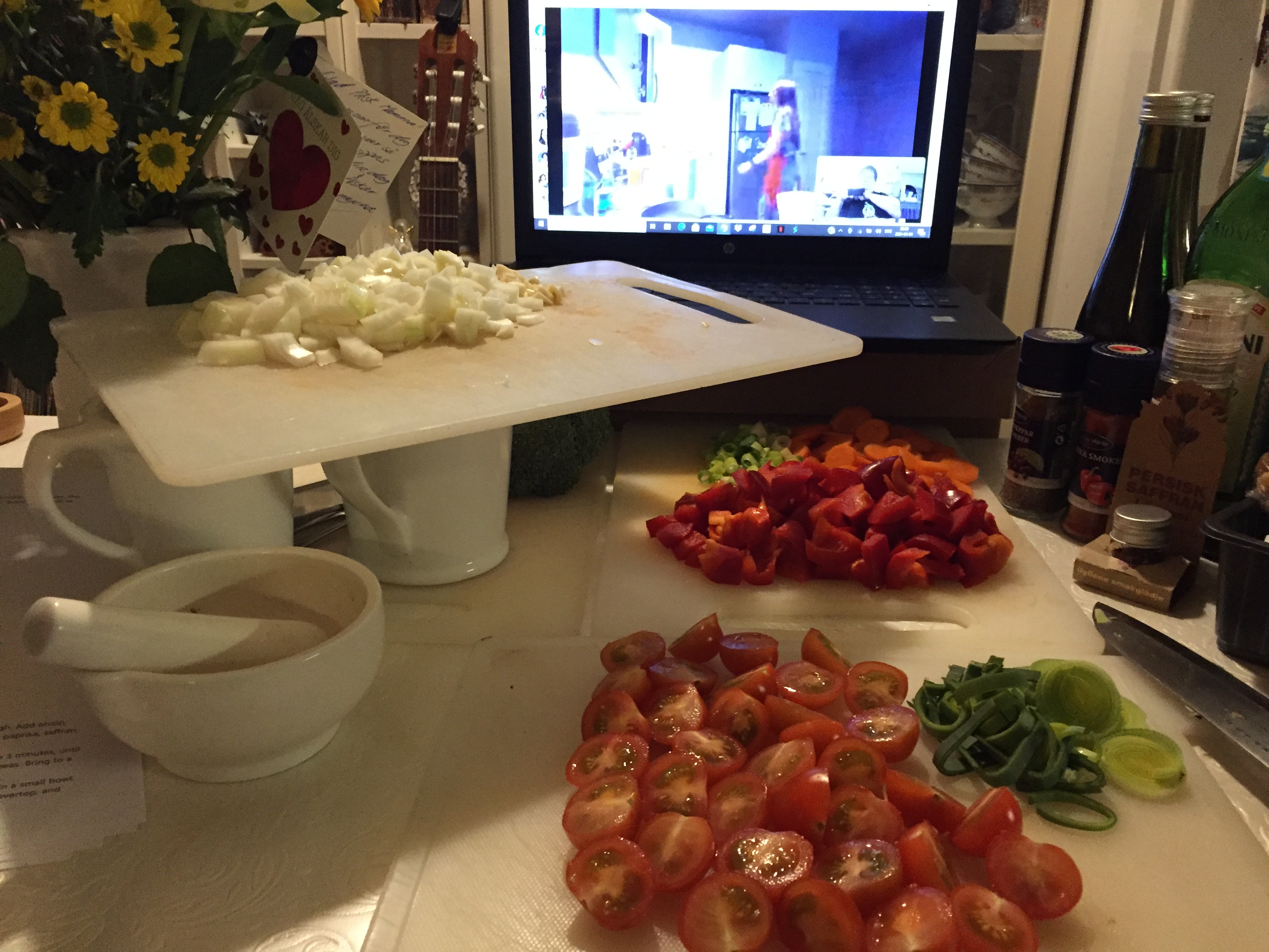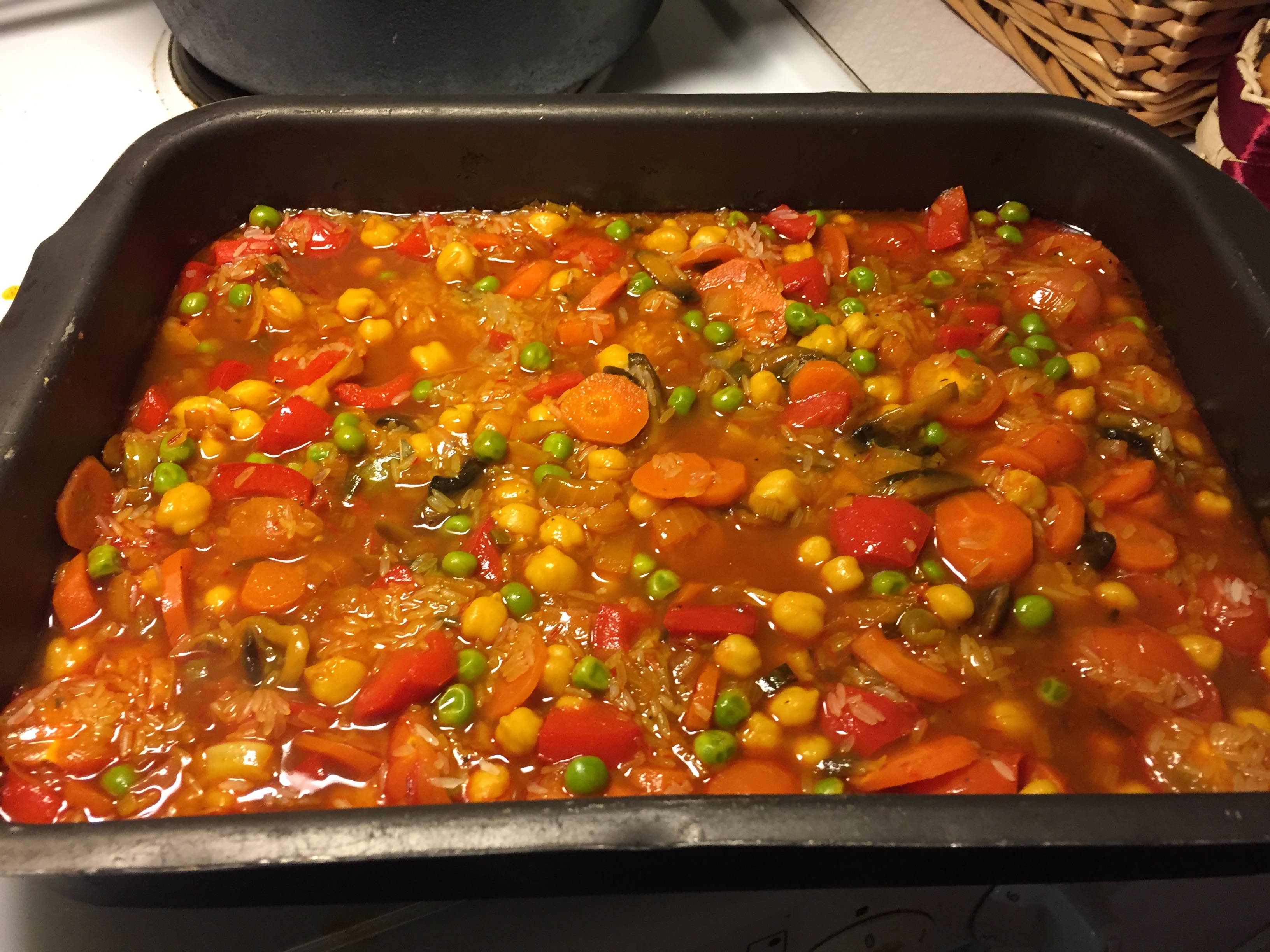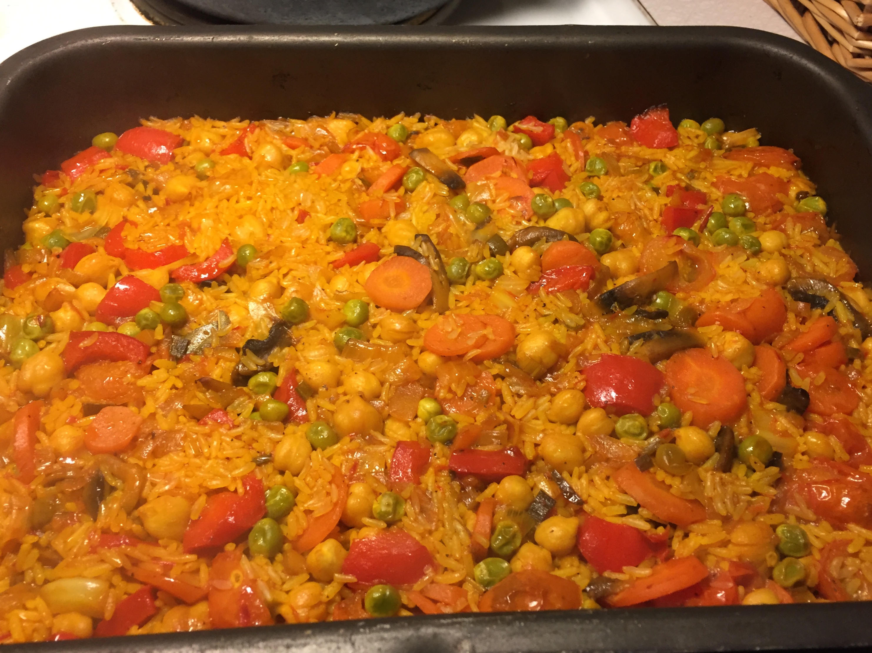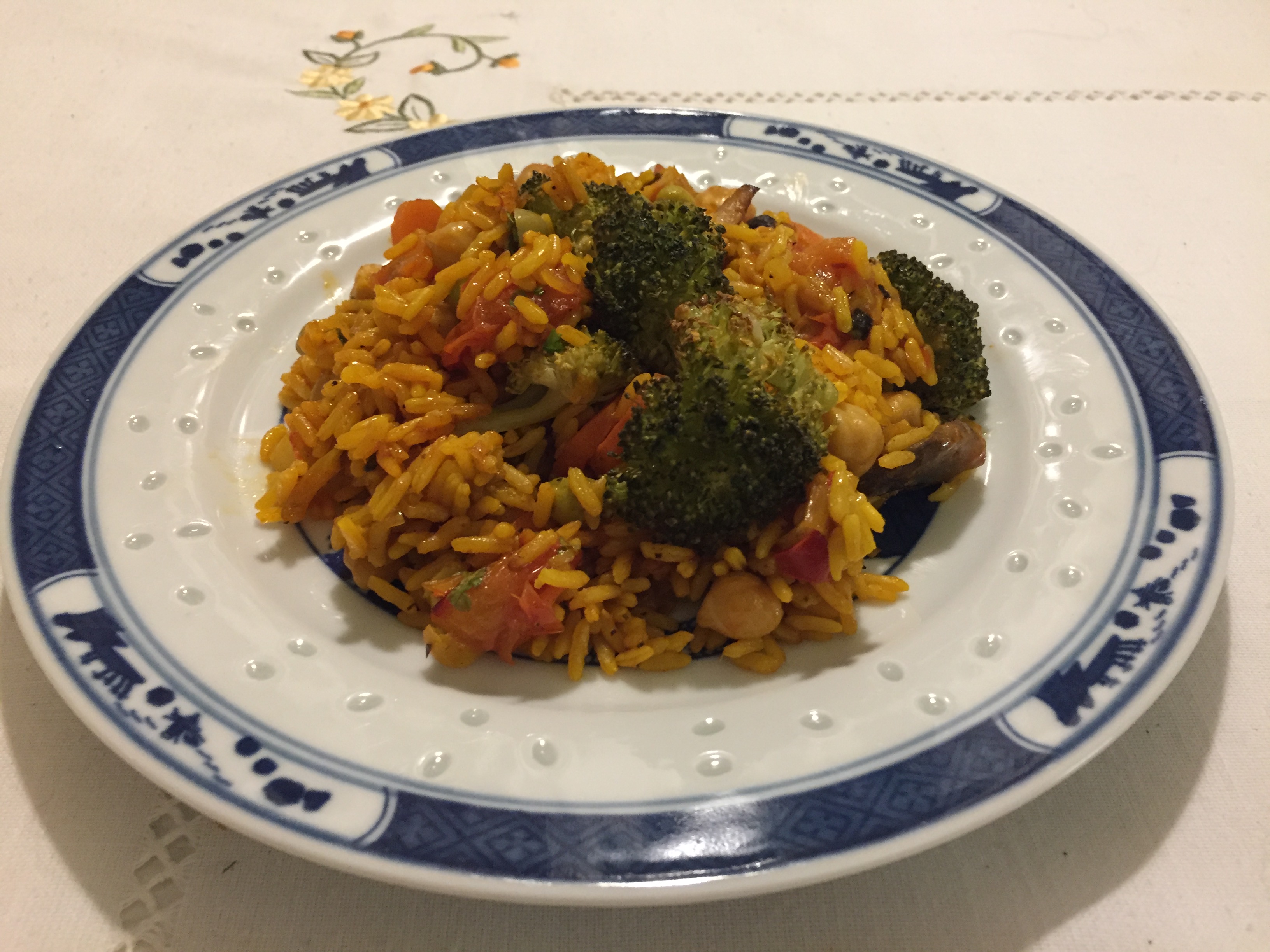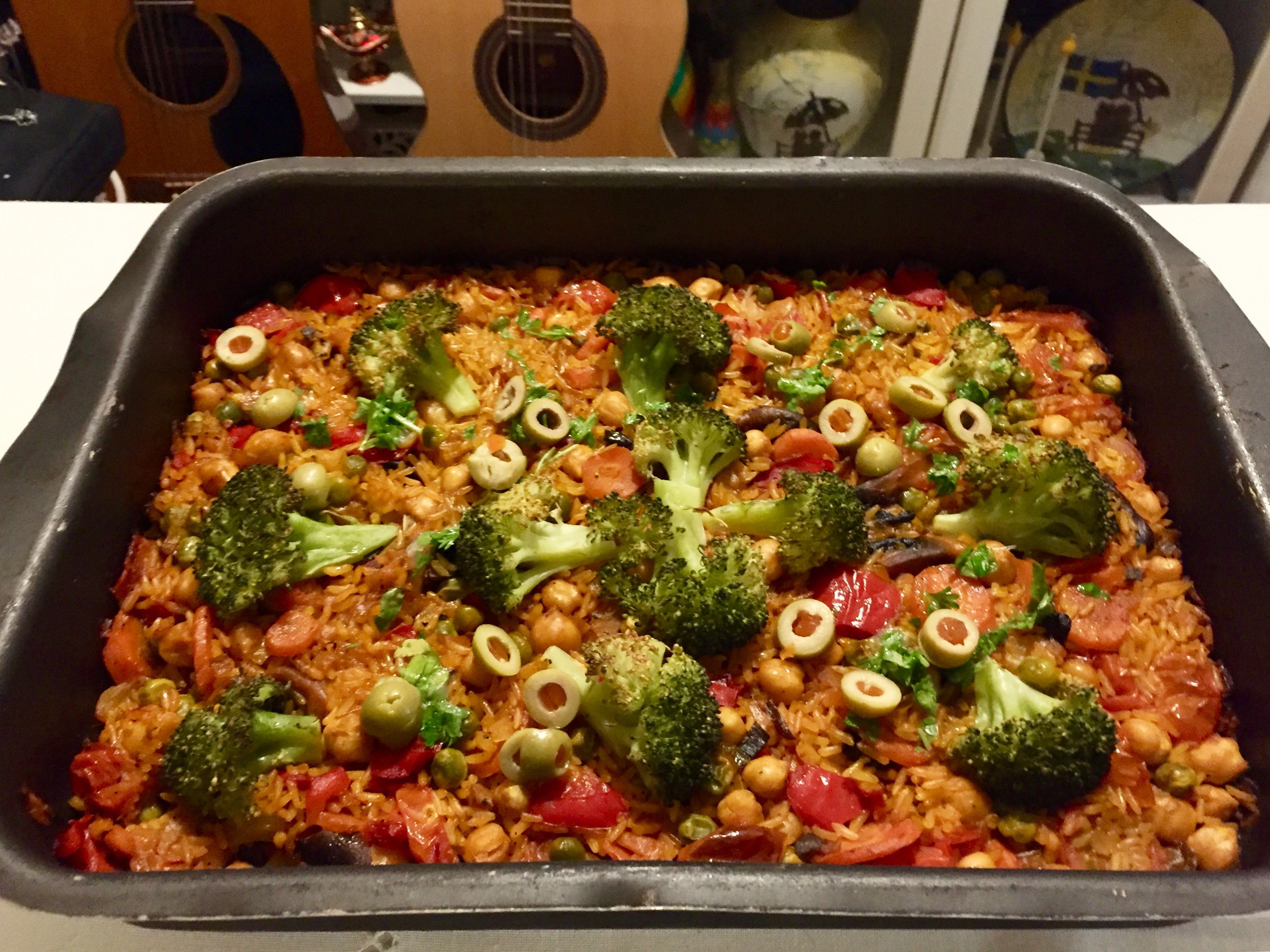 Cookalong with Frida and Ciana Sunday night. They in Frisco, Dallas Texas, USA and me here in Sollentuna Sweden. This time we made Paella, the National dish of Spain. We made Vegetarian Paella. It came out wonderful in flavors. Saffron and smoked paprika are the main spices in this dish. We used the vegetables we had, onions, garlic, carrots, zucchini, green peas, bell peppers, cabbage, chickpeas, tomatoes, broccoli. We also added mushrooms and vegetable broth. We did not have a Paella pan so we prepared all in the cast iron pan on the stove top and then switched to an oven pan and added the rice and finished it off in the oven. It tasted wonderful.
