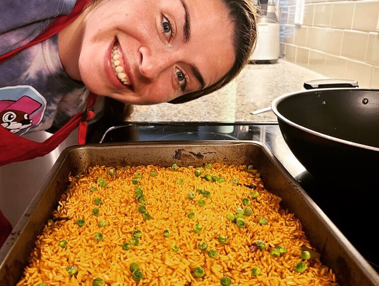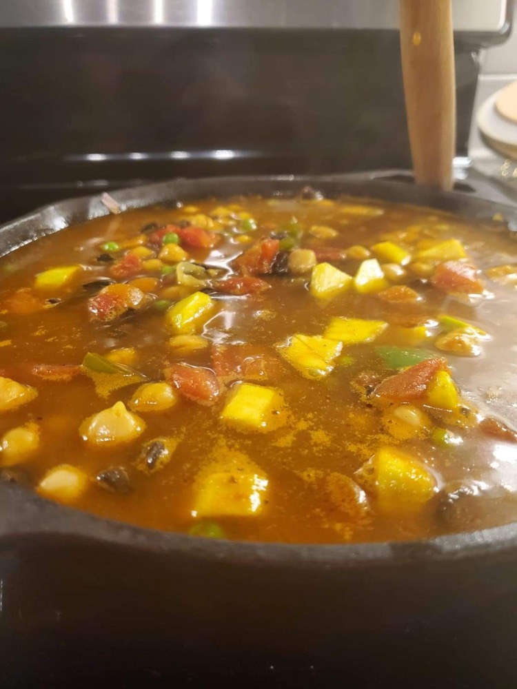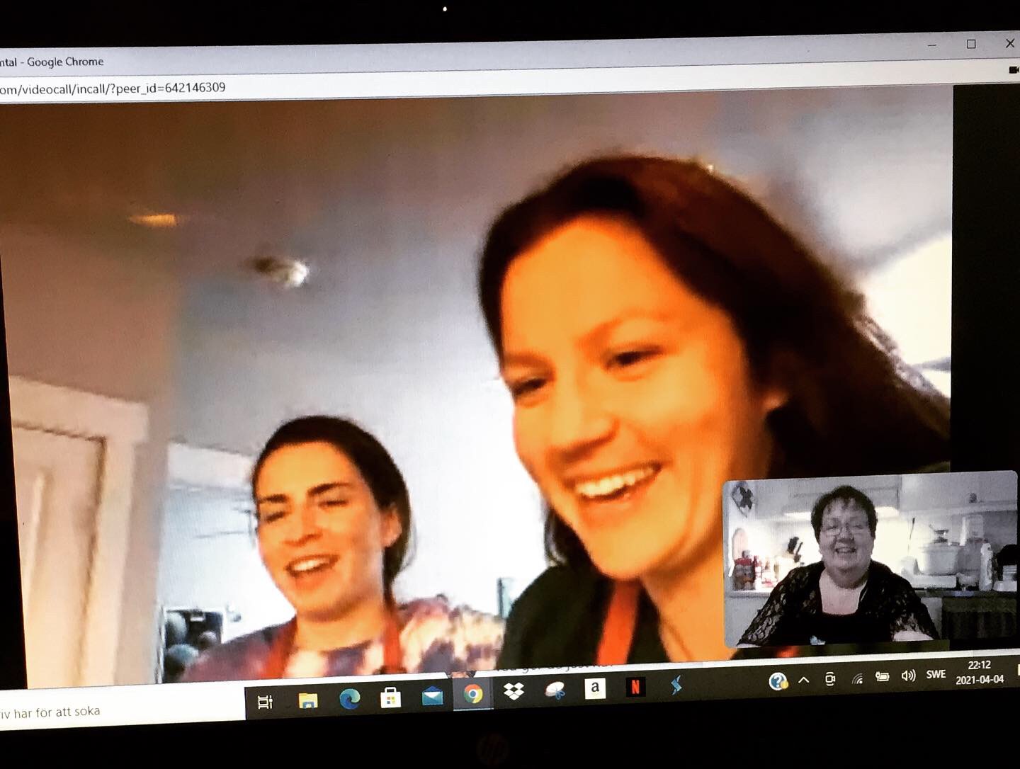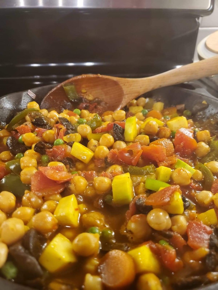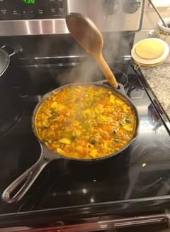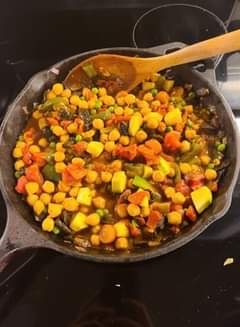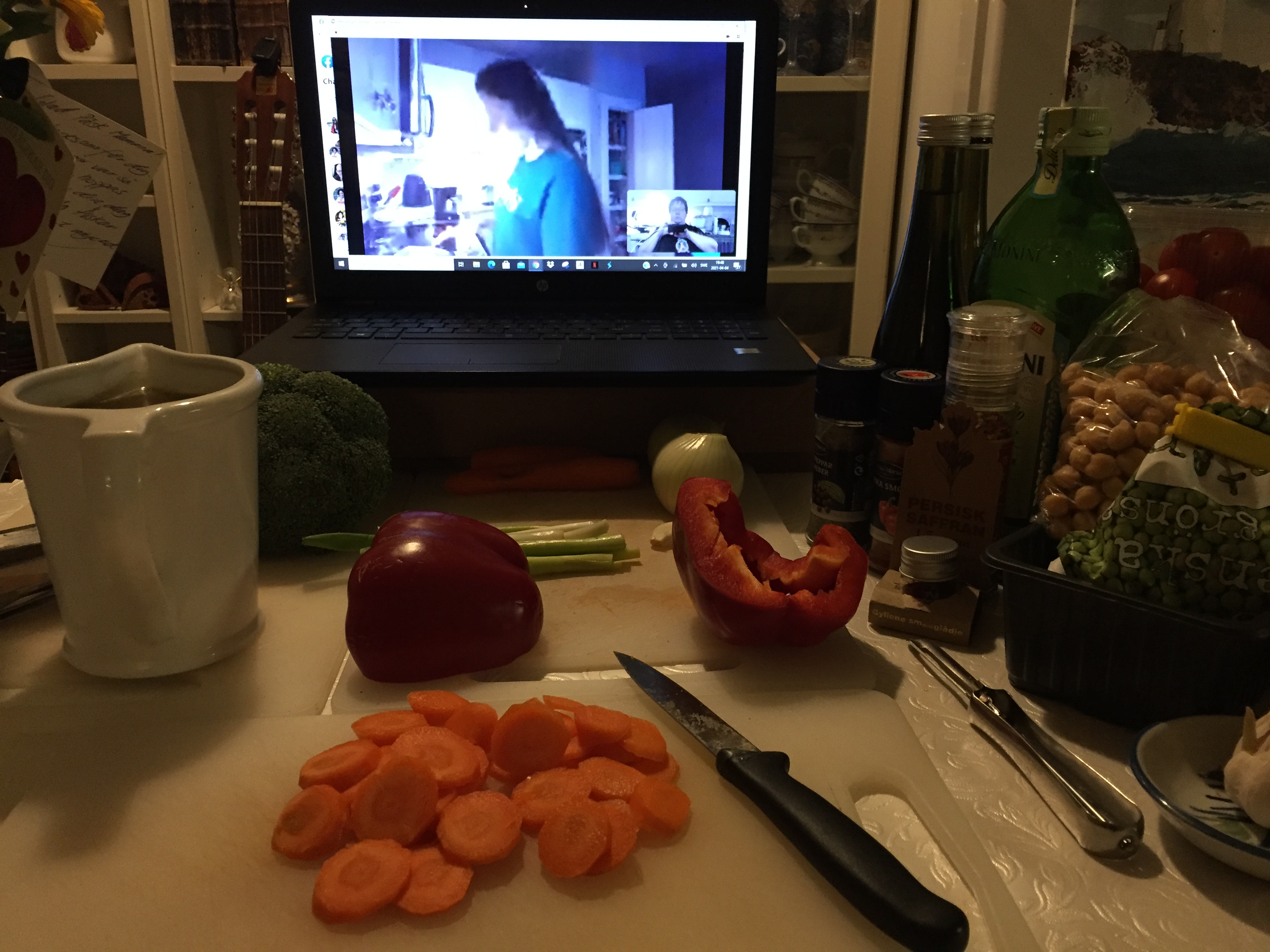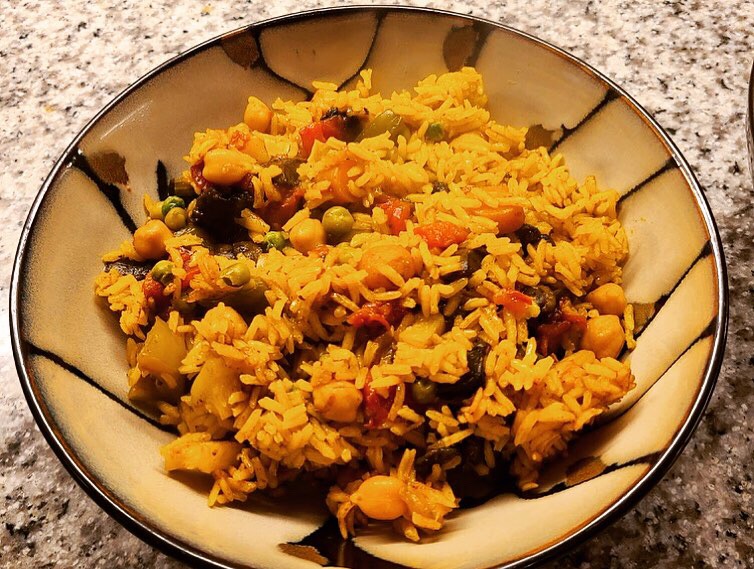 Cookalong with Frida and Ciana Sunday night. They in Frisco, Dallas Texas, USA and me here in Sollentuna Sweden. This time we made Paella, the National dish of Spain. We made Vegetarian Paella. It came out wonderful in flavors. Saffron and smoked paprika are the main spices in this dish. We used the vegetables we had, onions, garlic, carrots, zucchini, green peas, bell peppers, cabbage, chickpeas, tomatoes, broccoli. We also added mushrooms and vegetable broth. We did not have a Paella pan so we prepared all in the cast iron pan on the stove top and then switched to an oven pan and added the rice and finished it off in the oven. It tasted wonderful.