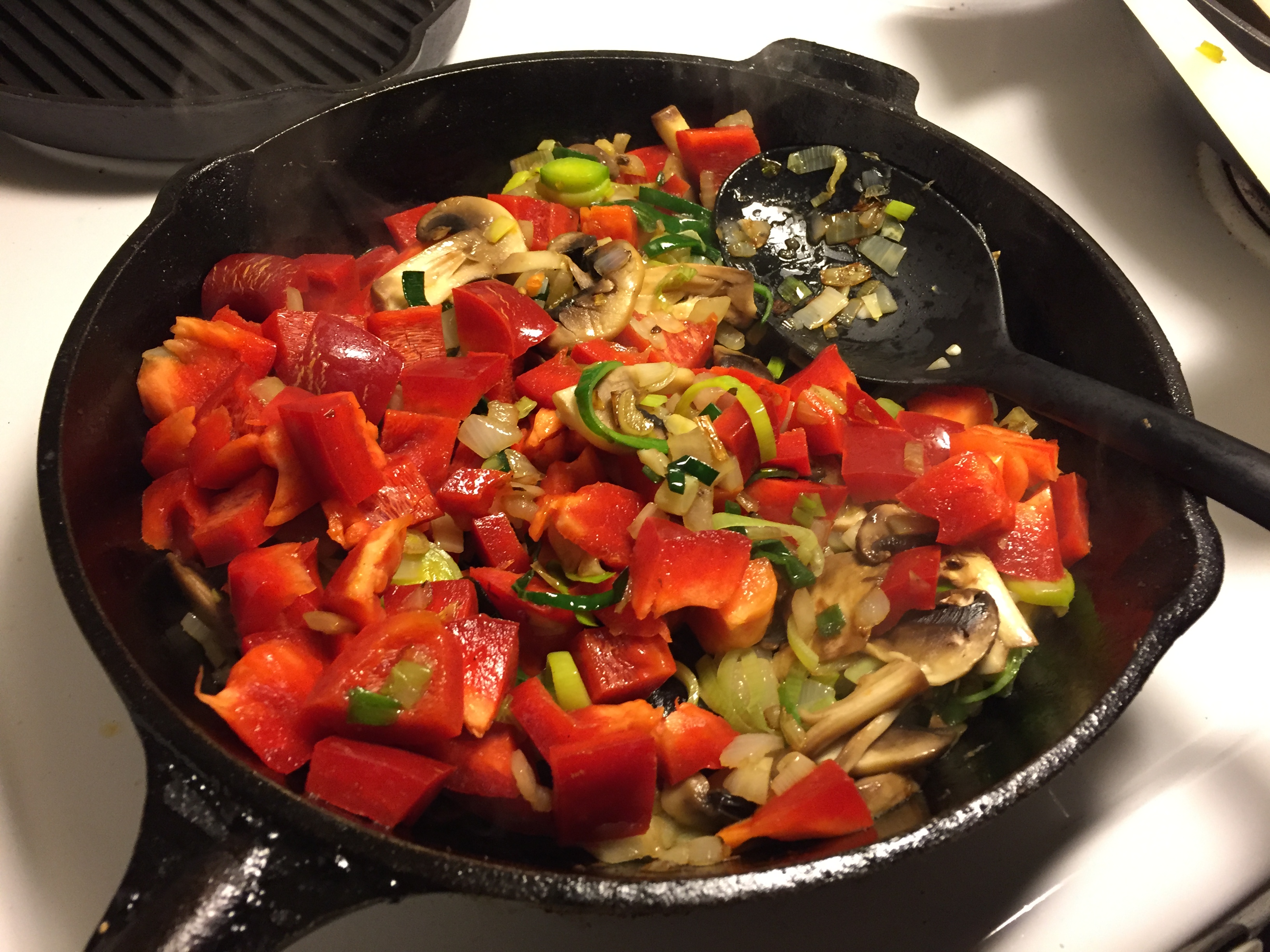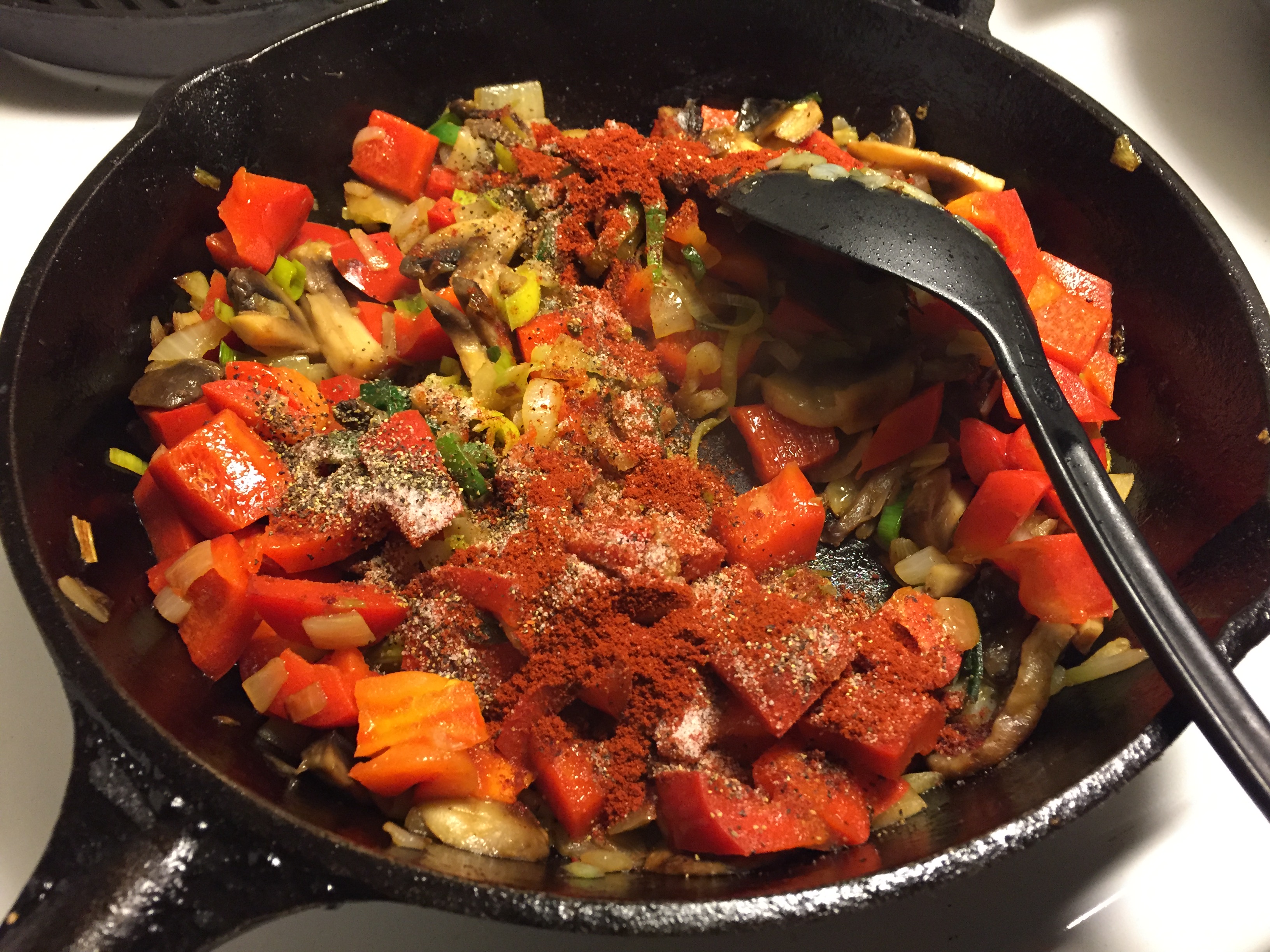 Heat 1/4 cup oil in a large pan (I used my cast iron pan). Do not use a non-stick pan. A steel pan or a paella pan is the best if you have those. Add onion, bell pepper, and mushrooms; cook 7 to 8 minutes, until softened. Add garlic, paprika, saffron, salt, and pepper; cook 2 minutes, until fragrant.