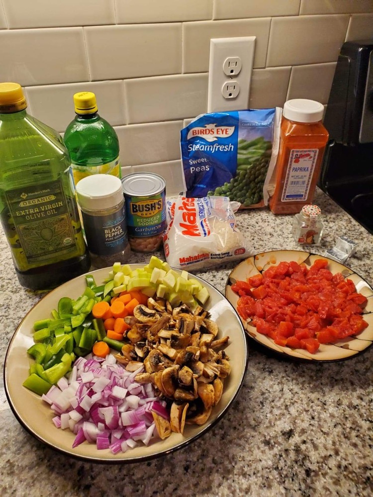 Add wine and cook 2 to 3 minutes, until mostly reduced. Stir in chickpeas, tomatoes, green peas and the rest of your vegetables. Add the rest of the broth and bring to a low boil. Here you can either finish the rest in your pan on the stove top or switch to a oven pan. I did not have a large enough frying pan so I switched to a oven pan. The pan needs to be wide.