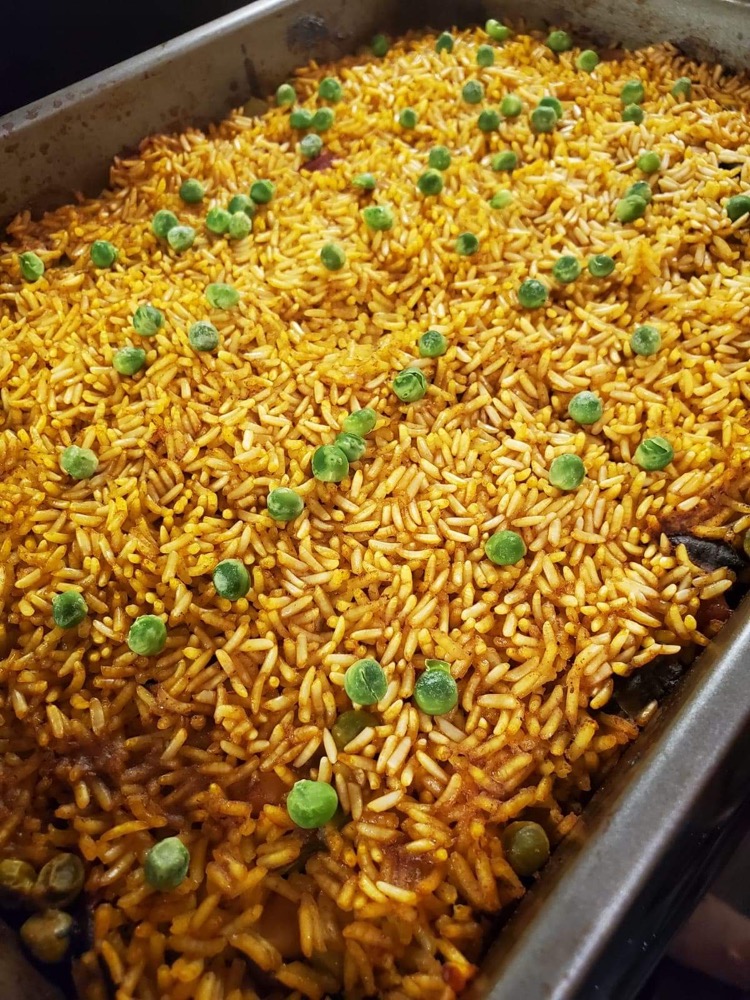 I did not succeed in getting the succarate (crisp bottom). It might be I need a Paella Pan for that and higher heat than the stove or oven can give. This is what I have read: ”Socarrat tends to form in special conditions: when the rice is cooked in a steel paella pan over a wood fire.” Maybe one day I can make it the traditional way. (What is soccarat? This is the crispy golden crust that is supposed to form on the bottom of the pan. It infuses the paella with a deep smoky and slightly nutty flavor. Once the broth starts cooking off, that’s when the socarrat magic starts to happen. You should hear a subtle snap, crackle and popping sound. Plus, you’ll smell a toasty aroma.)