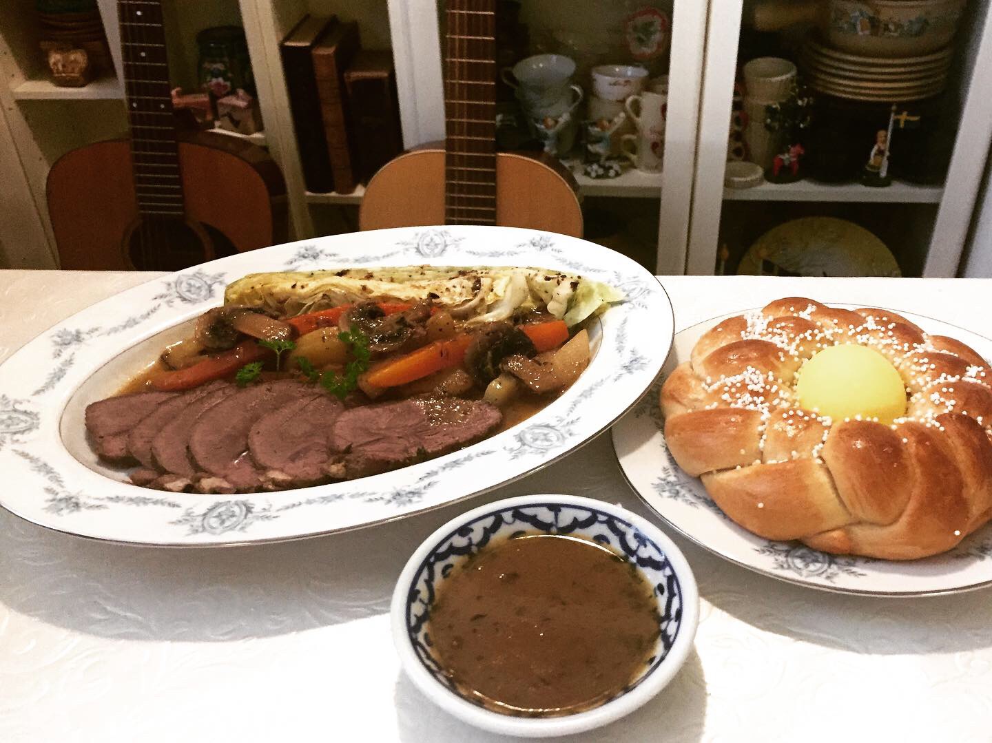 My Easterdinner Easter Sunday was Lambroastbeef with Carrots, Rutabaga, potatoes, cabbage, mushrooms and sauce from the roasting. With it I had my Italien Easterbread with the egg. The sauce from the roast was delicious for dipping the bread. I was so satiesfied with my Eastermeal. It was my first time to make Lambroastbeef. And this meal was a different style from a typical Swedish Easter dinner. Since I am alone I skipped the buffée dishes that is usually my Eastermeal tradition since living so long in Sweden.