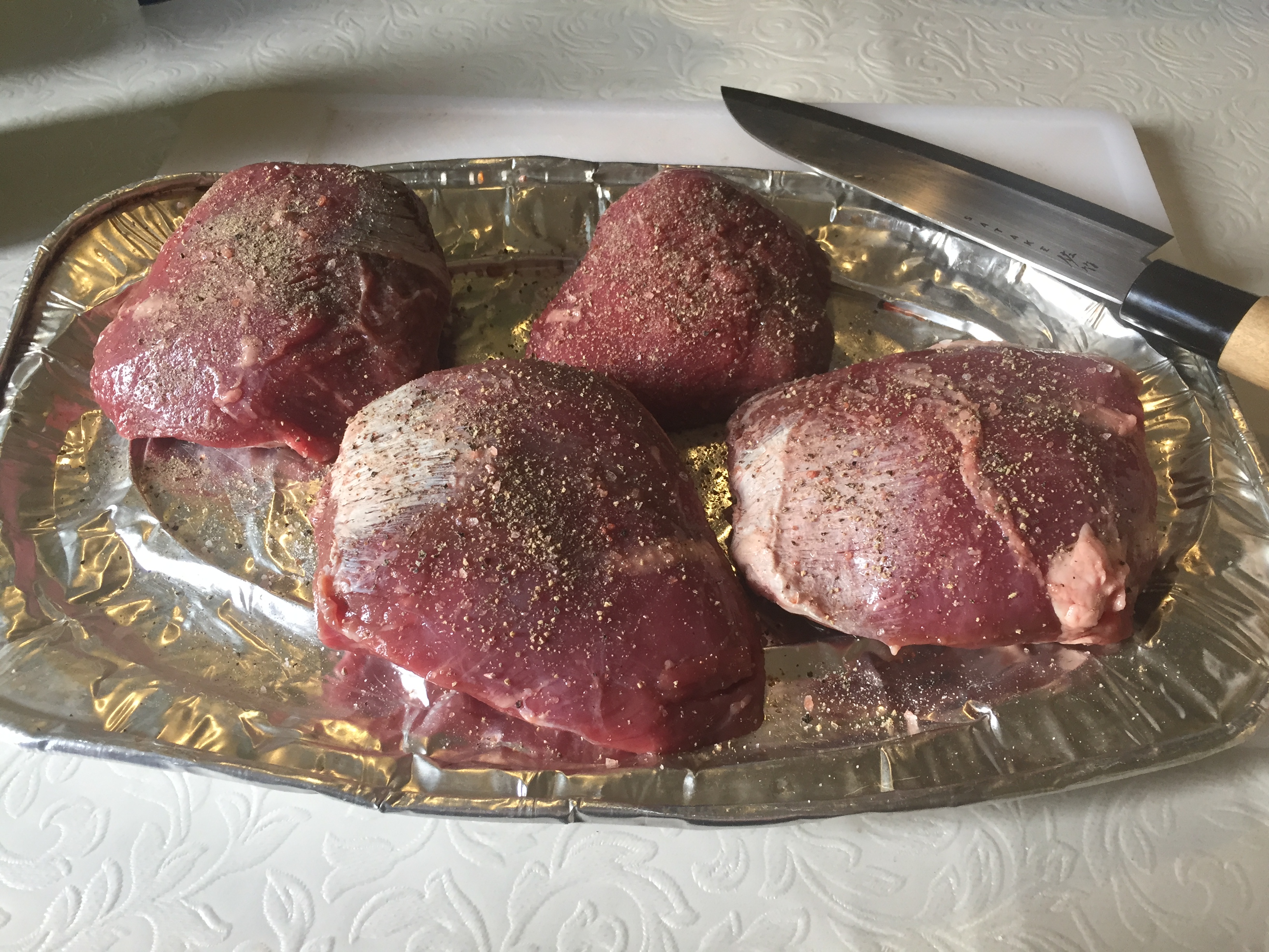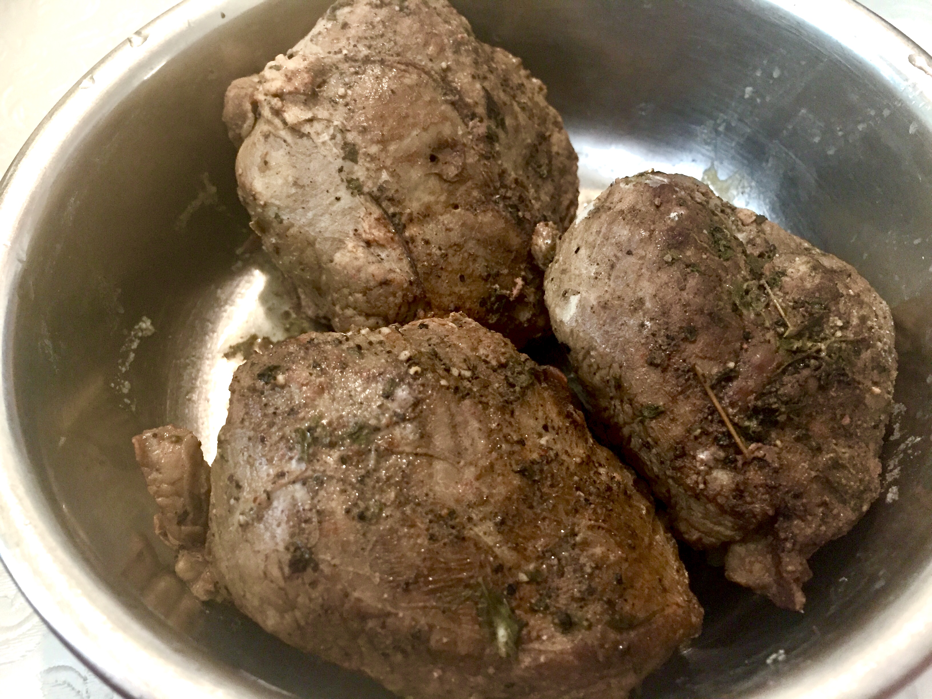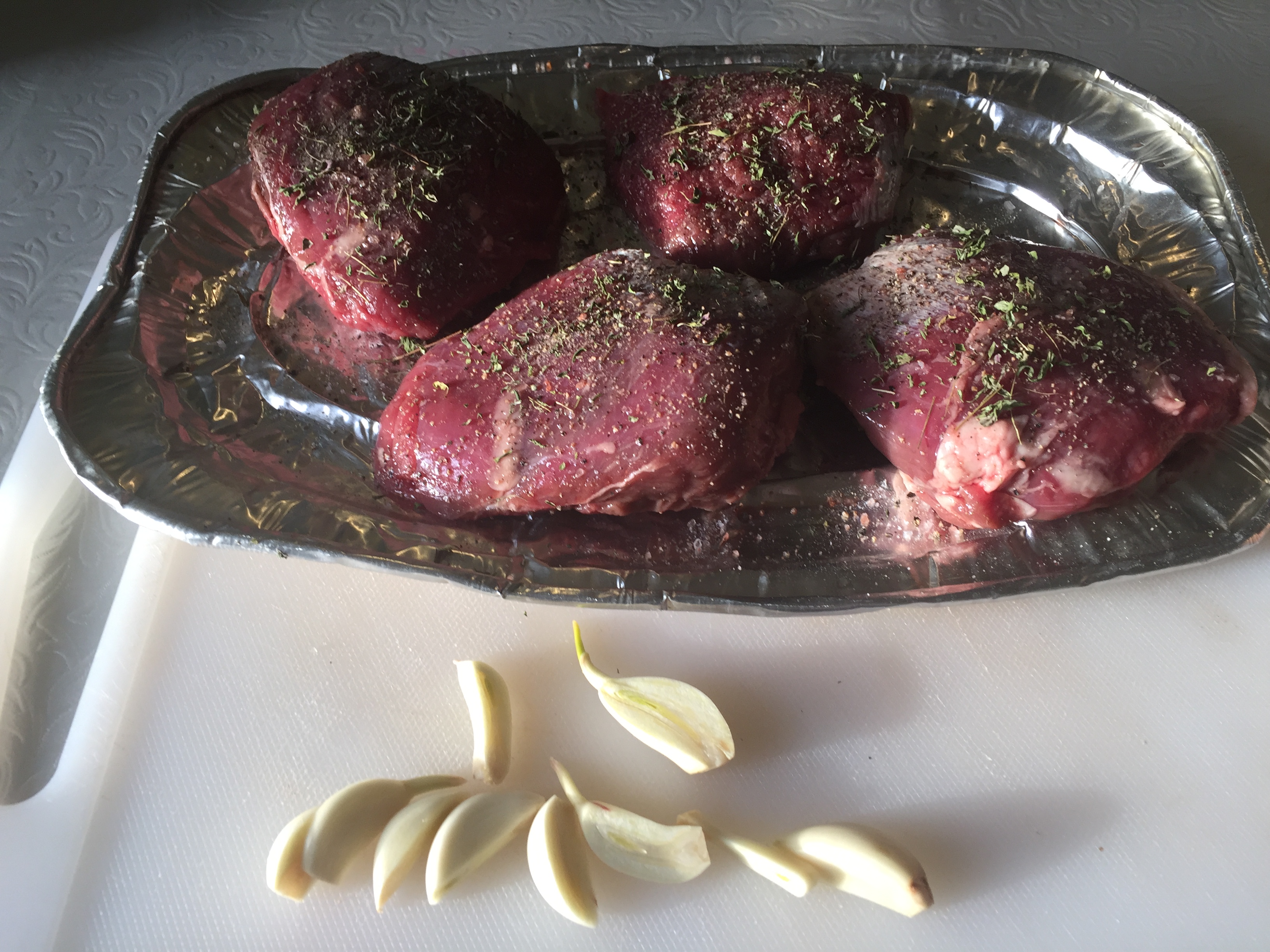 Prepare the Lamb Roast Beef by sprinkling salt, pepper, thyme all around them on all sides. Leave to rest for 15 minutes.