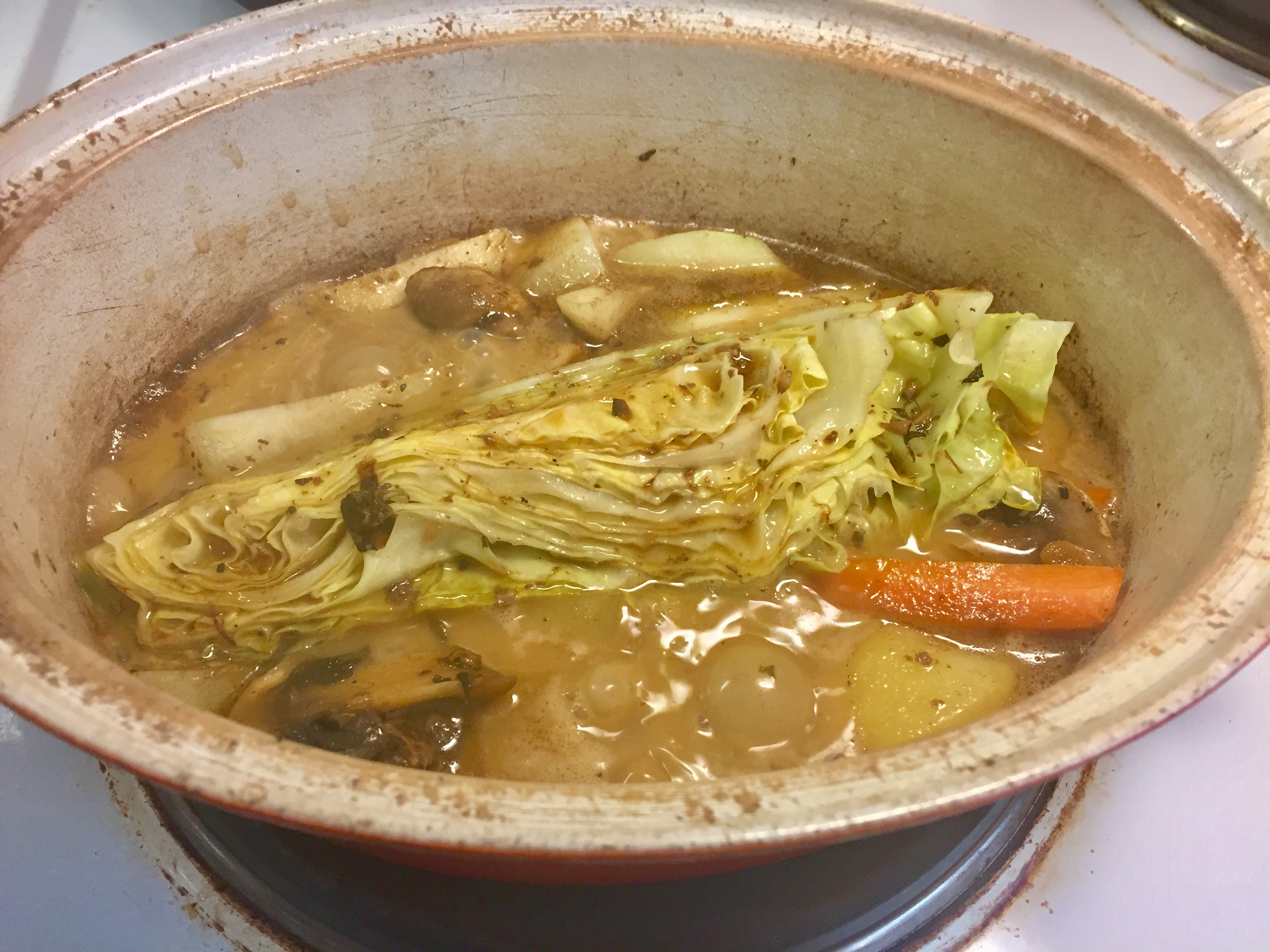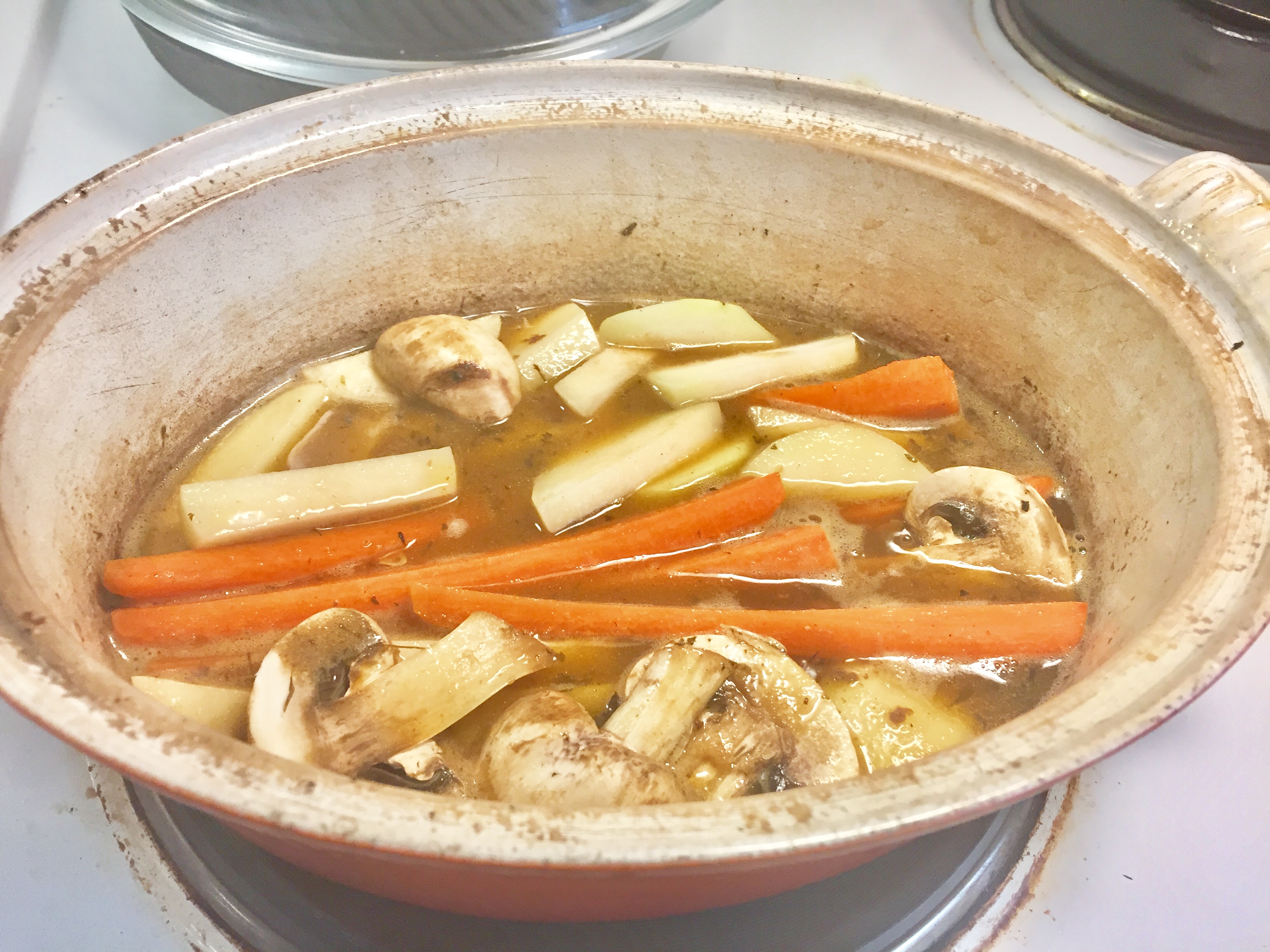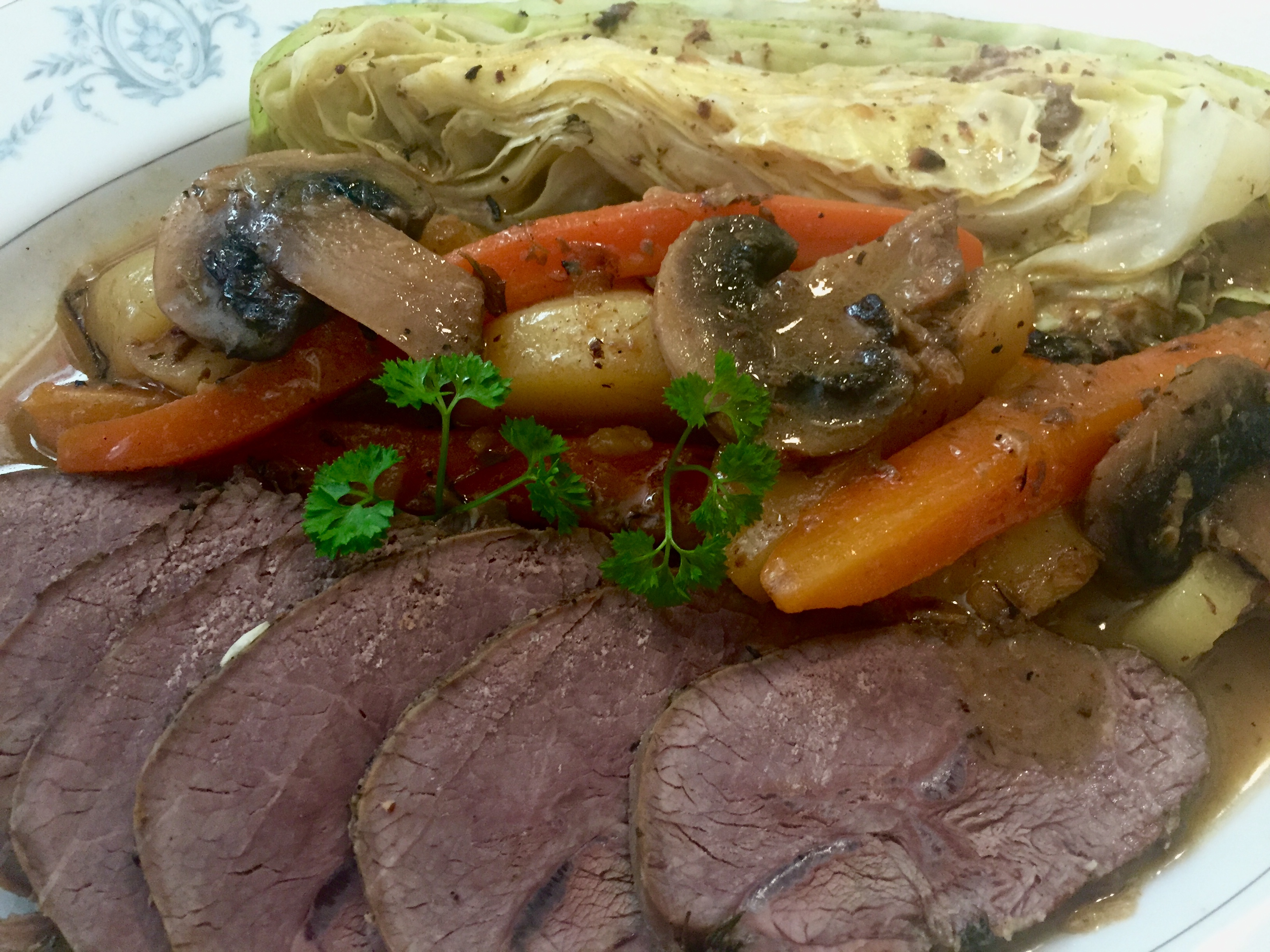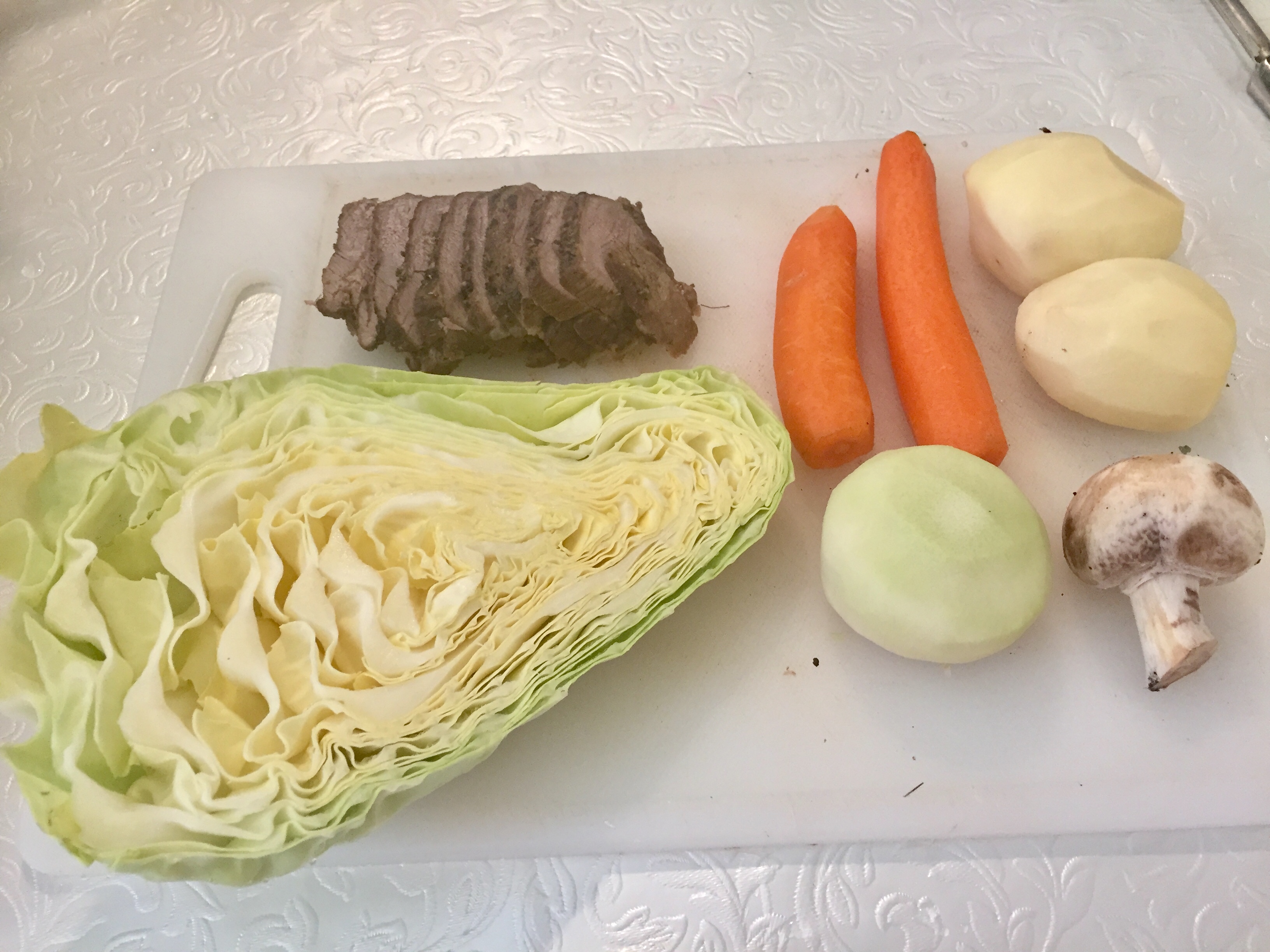 (How much you want of vegetables depends on how many are going to eat. I was alone so I used 2 potatoes, 2 carrots, one small rutabaga, 1 mushroom, half a cabbage.) And even from this I would have some extra servings). The Lamb Roast Beef I could cut and freeze for later.)