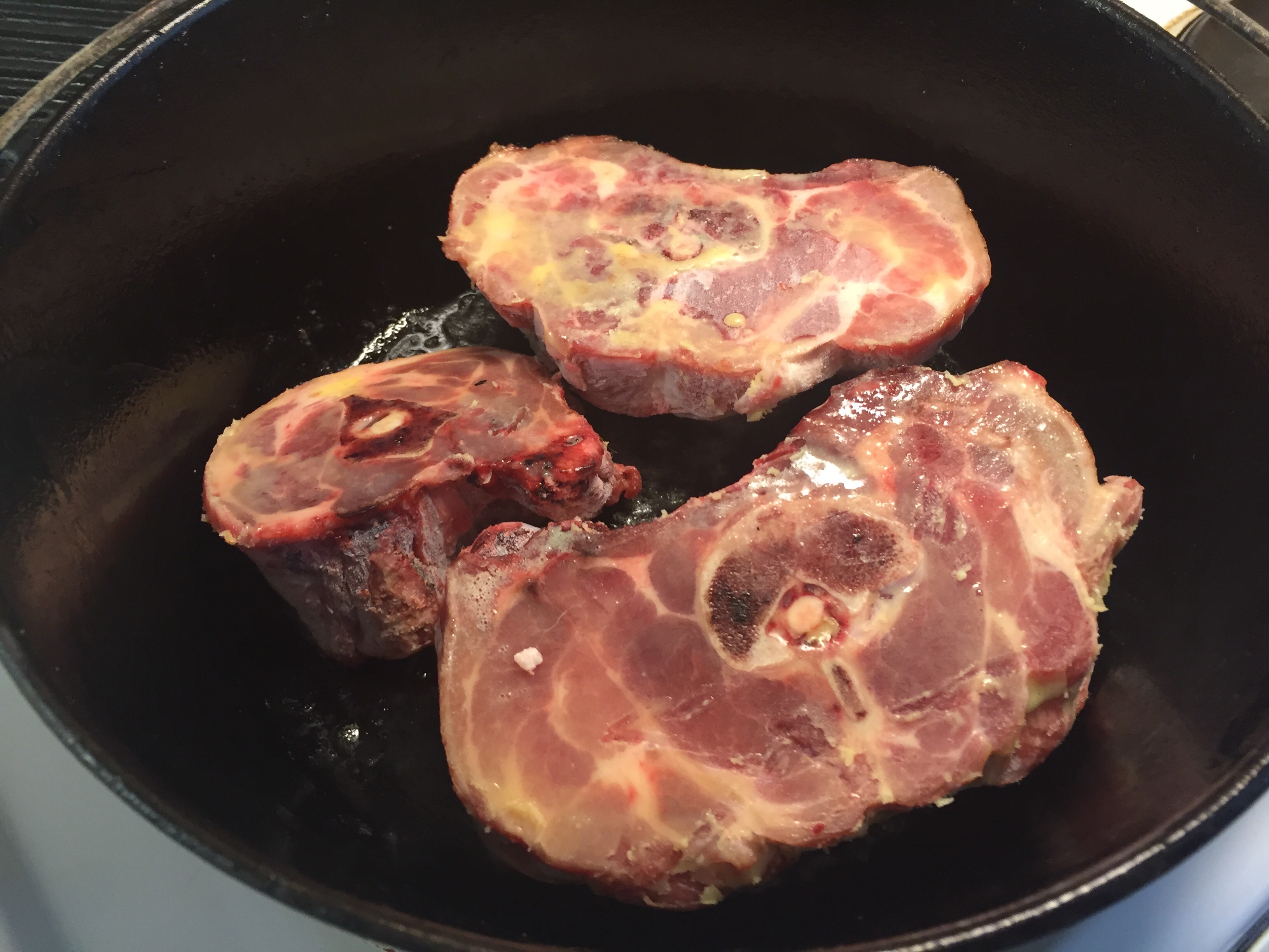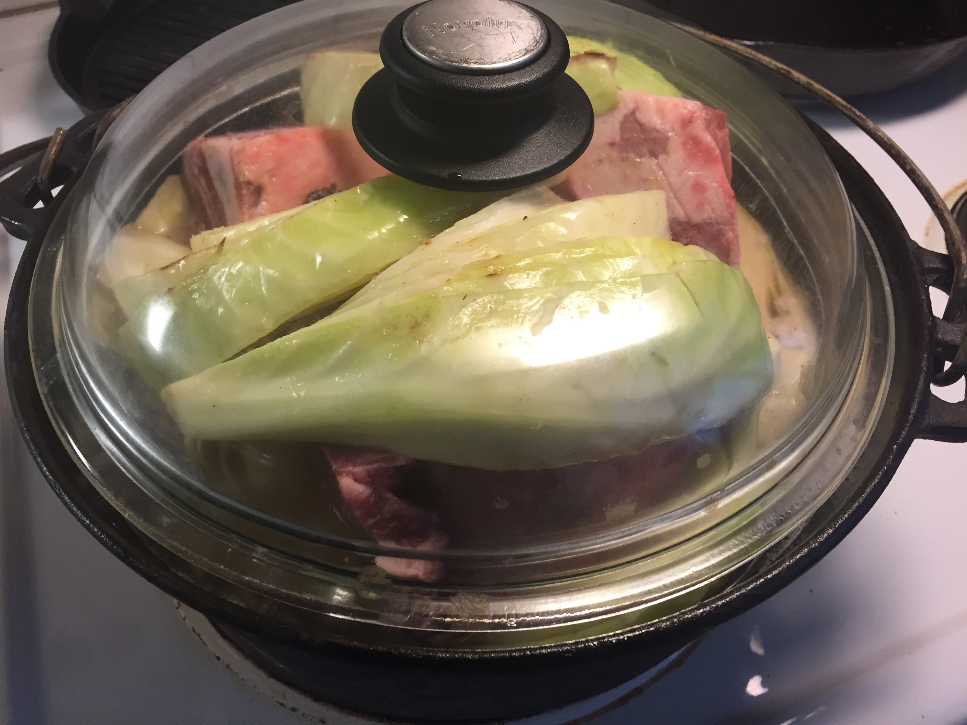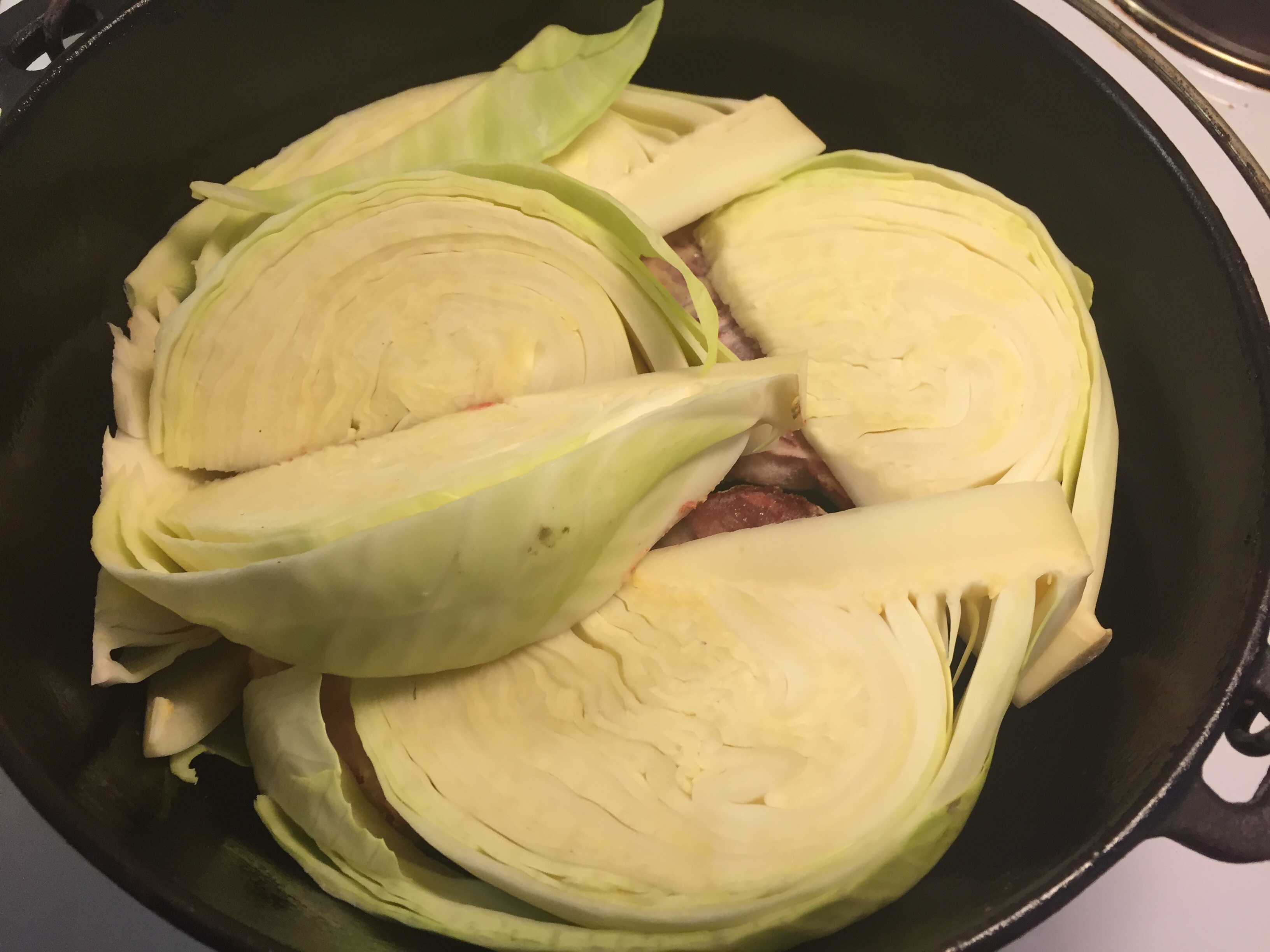 Pour on water. Bring to the boil, put on the lid and lower the heat. Let simmer until the meat is tender (until it comes off the bones ) about 2,5 hours. Do not add too much water. The cabbage will release water also while zimmering.
