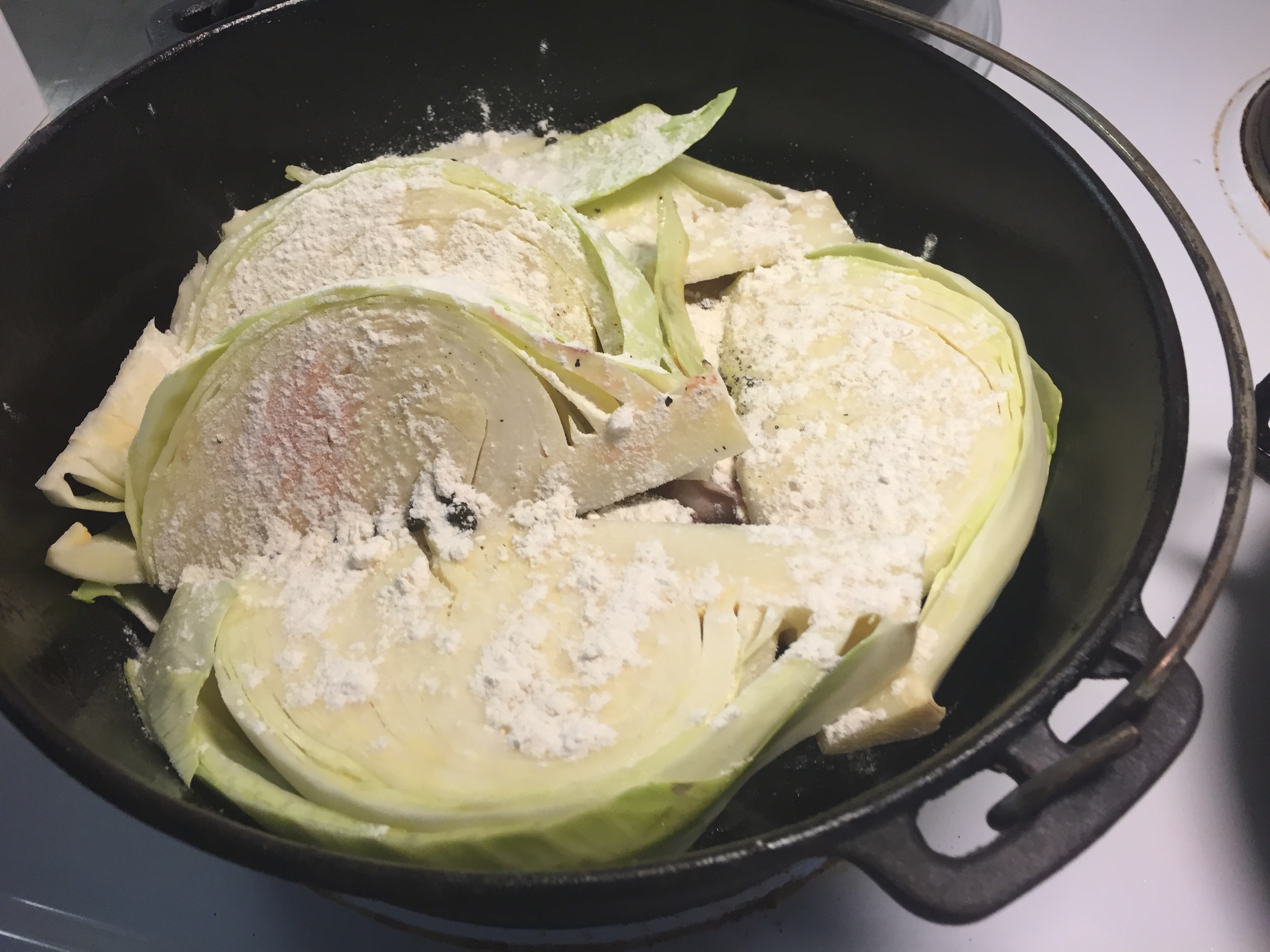 Layer meat and cabbage in the saucepan (meat at the bottom with the fat side down). Sprinkle flour, salt and pepper between the layers.