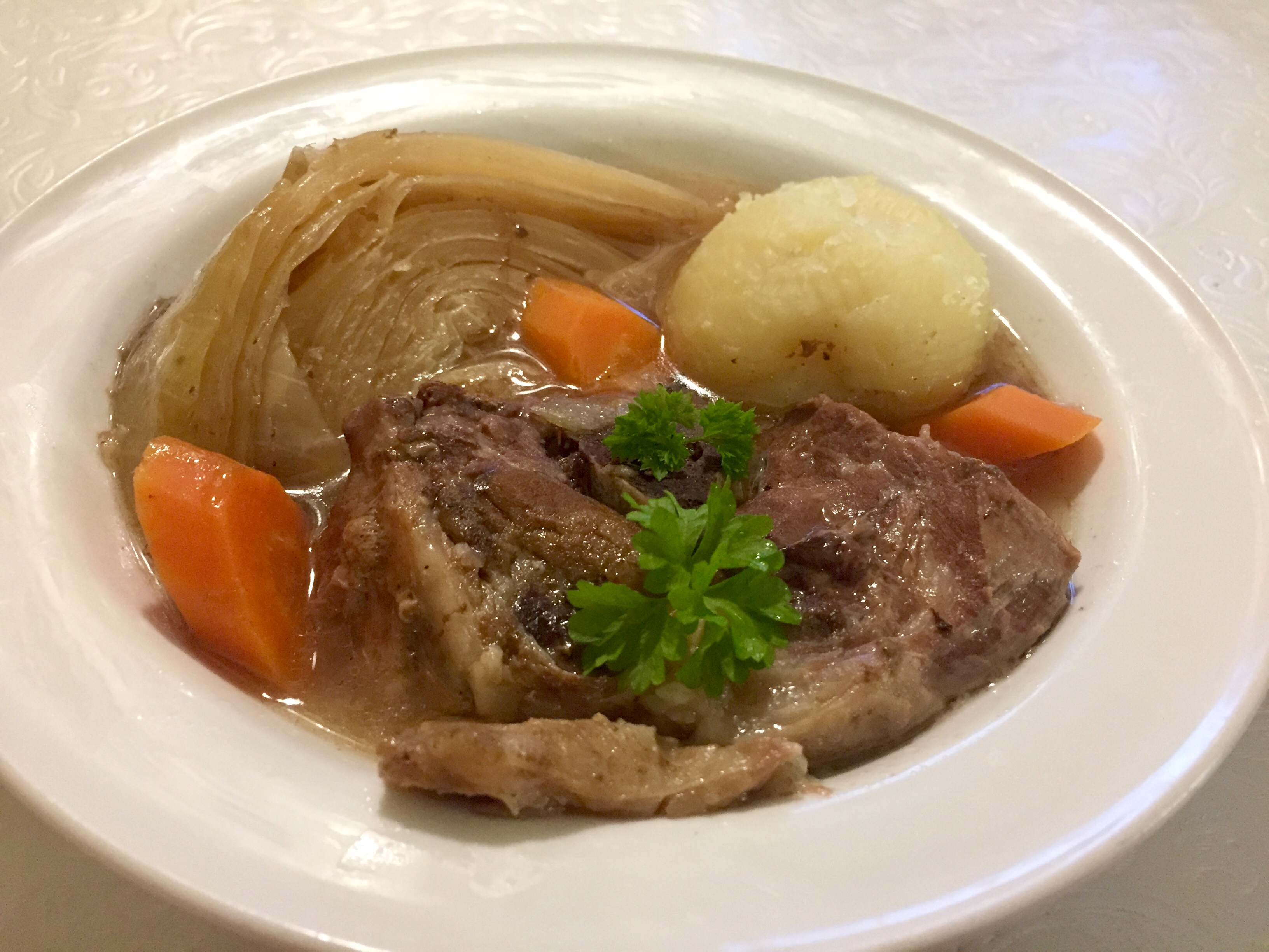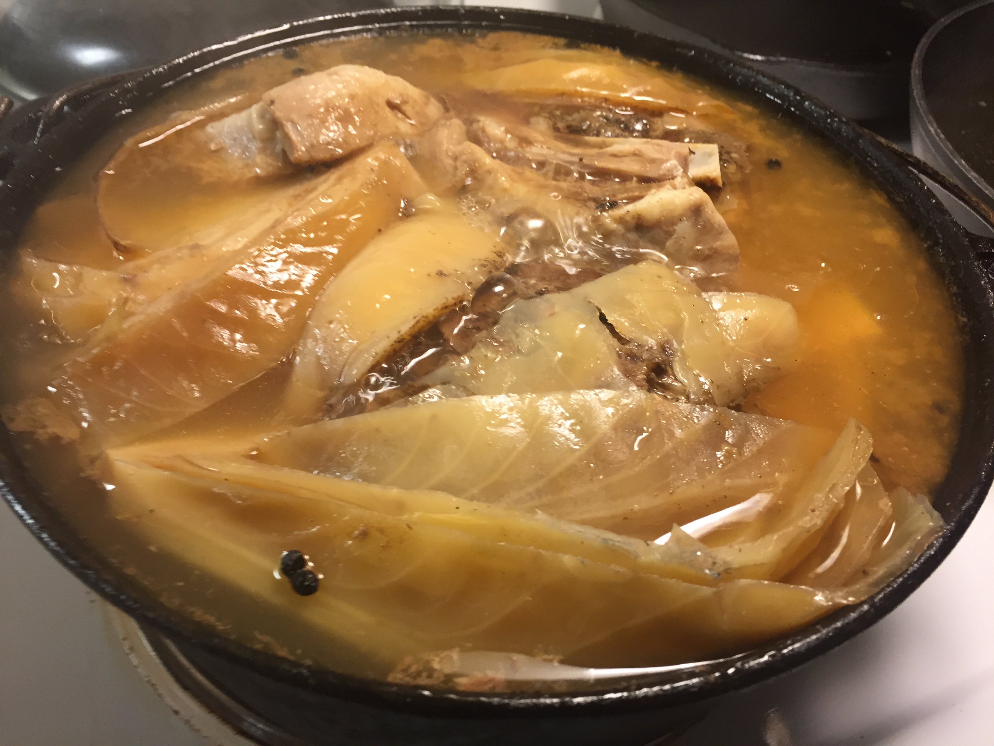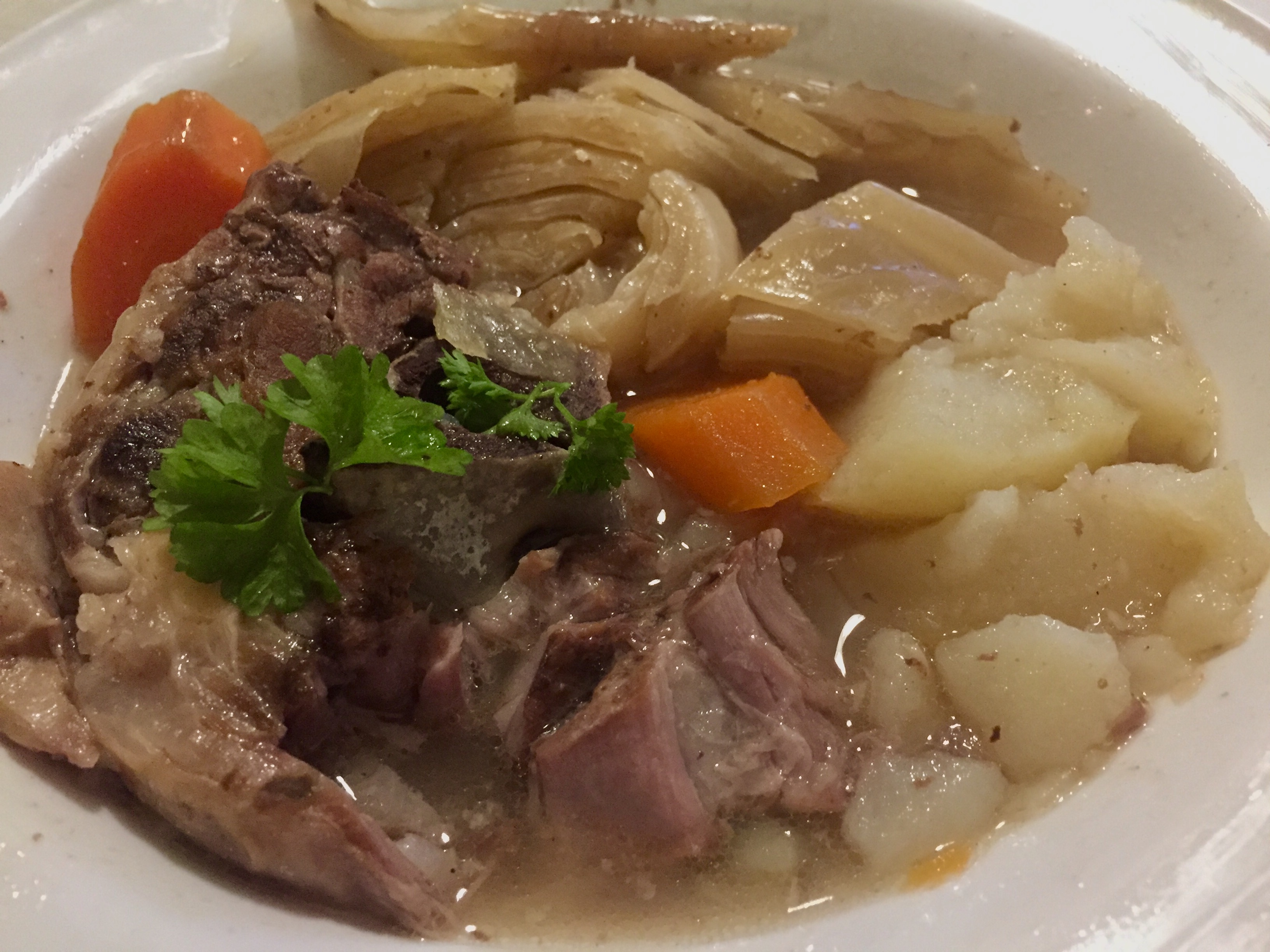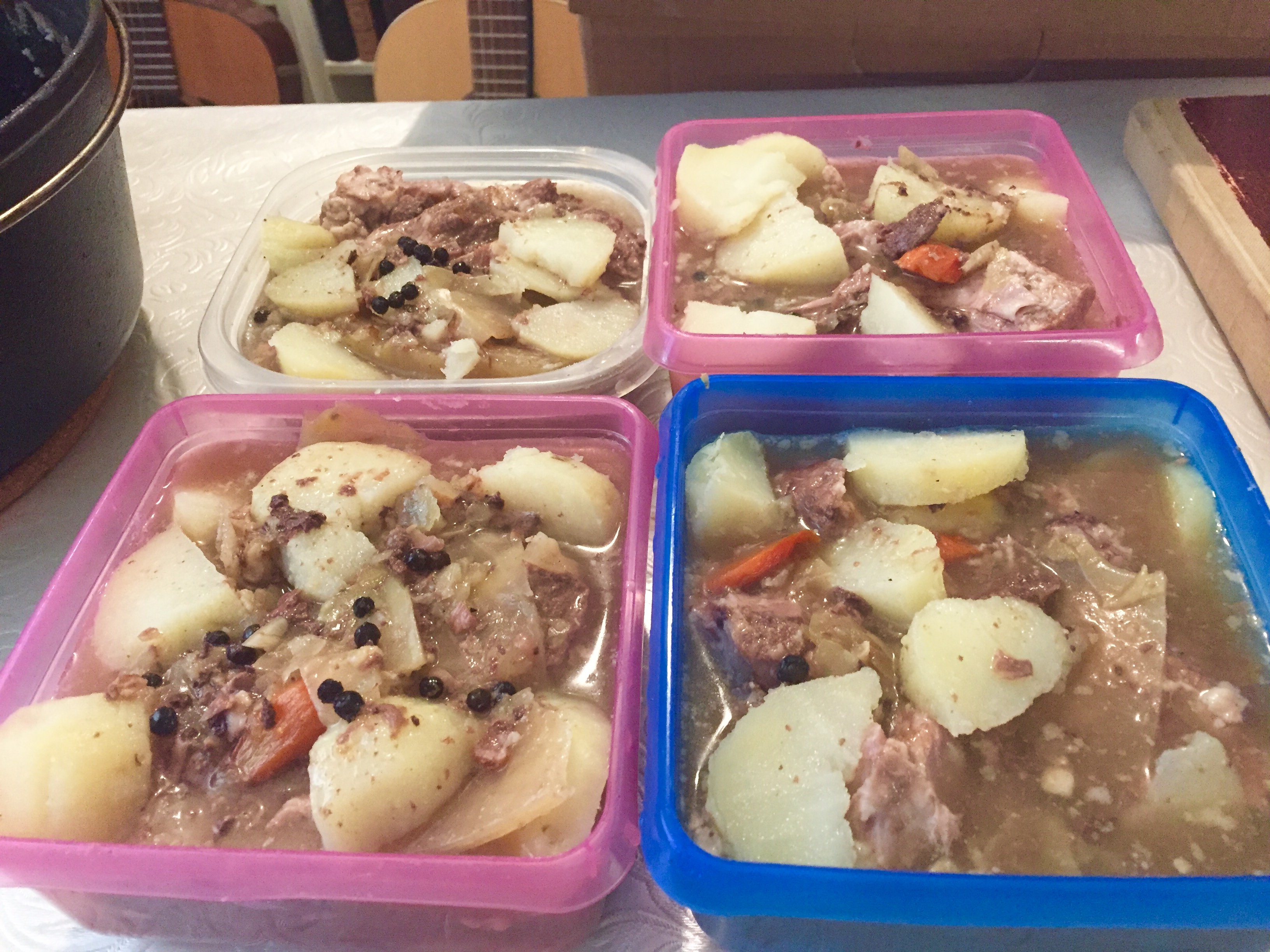 I used my mothers recipe from her chefs cookbook from 1957. That day she cooked for 379 people and she used 115 kg lamb meat, 100 kg cabbage, 30 liter water, 1, 5 kg flour, 2 kg salt, 400 g whole black peppercorns and 90 kg potatoes on the side. I did have to recalculate for my single household.