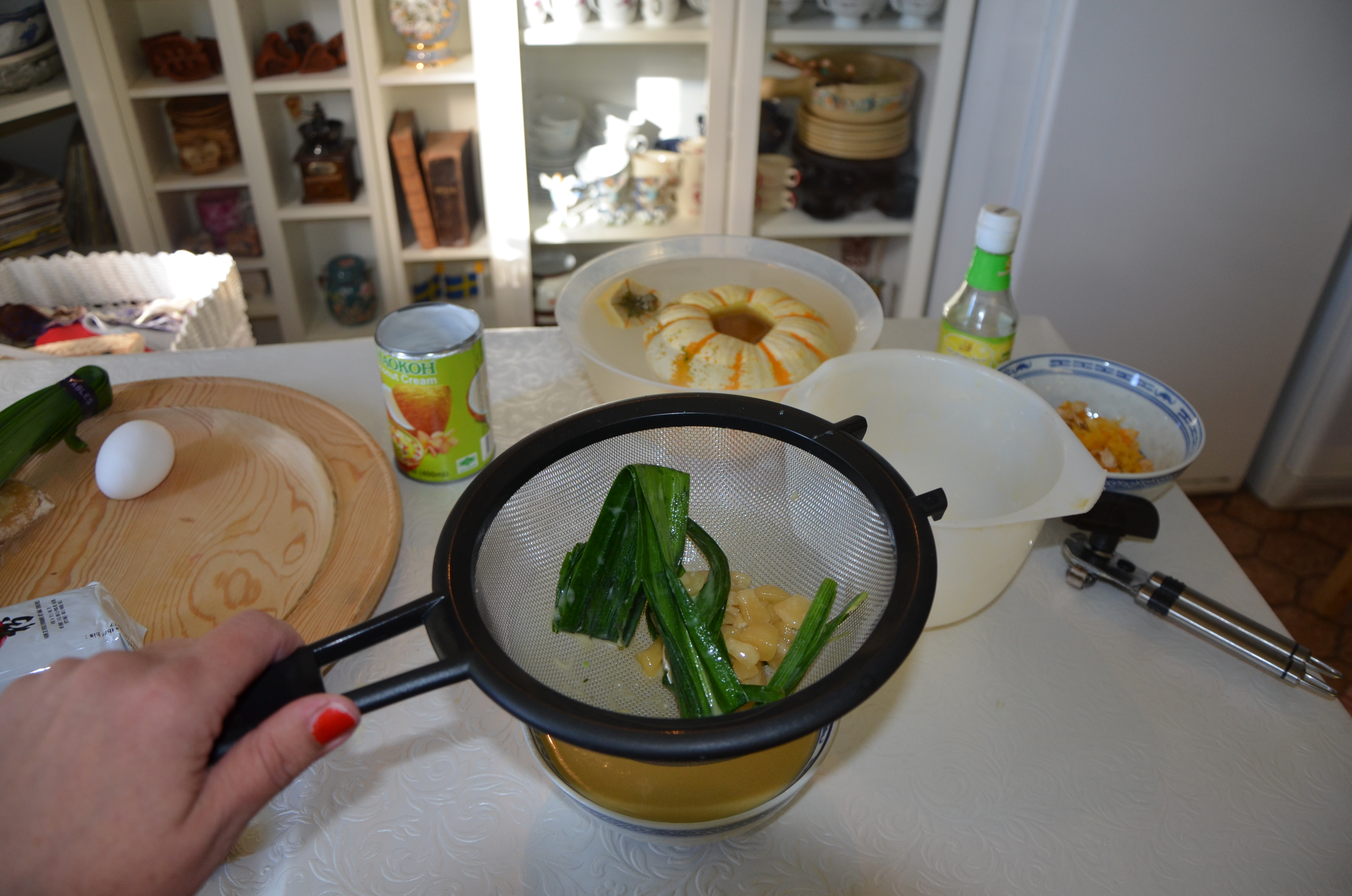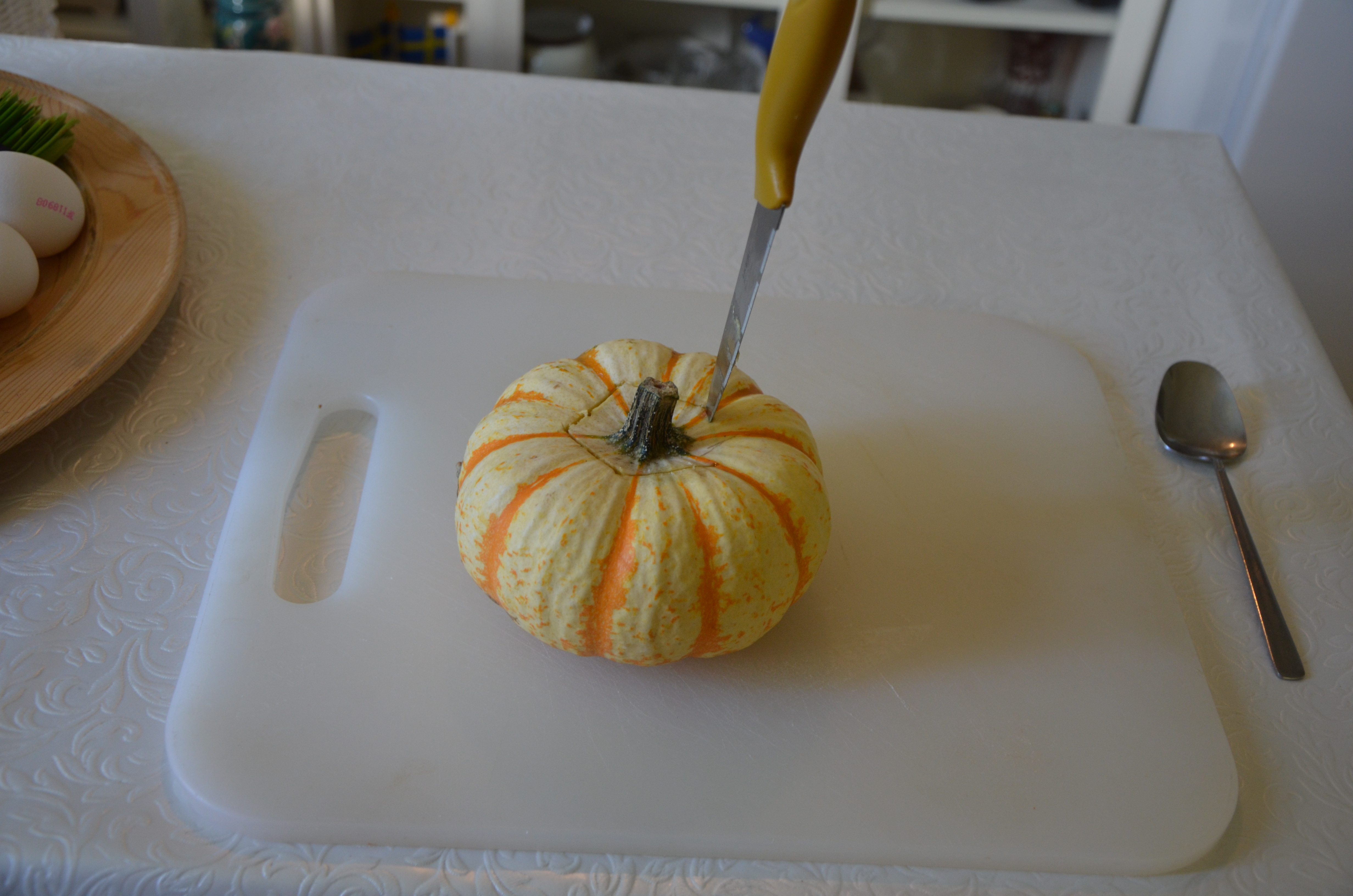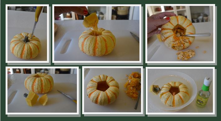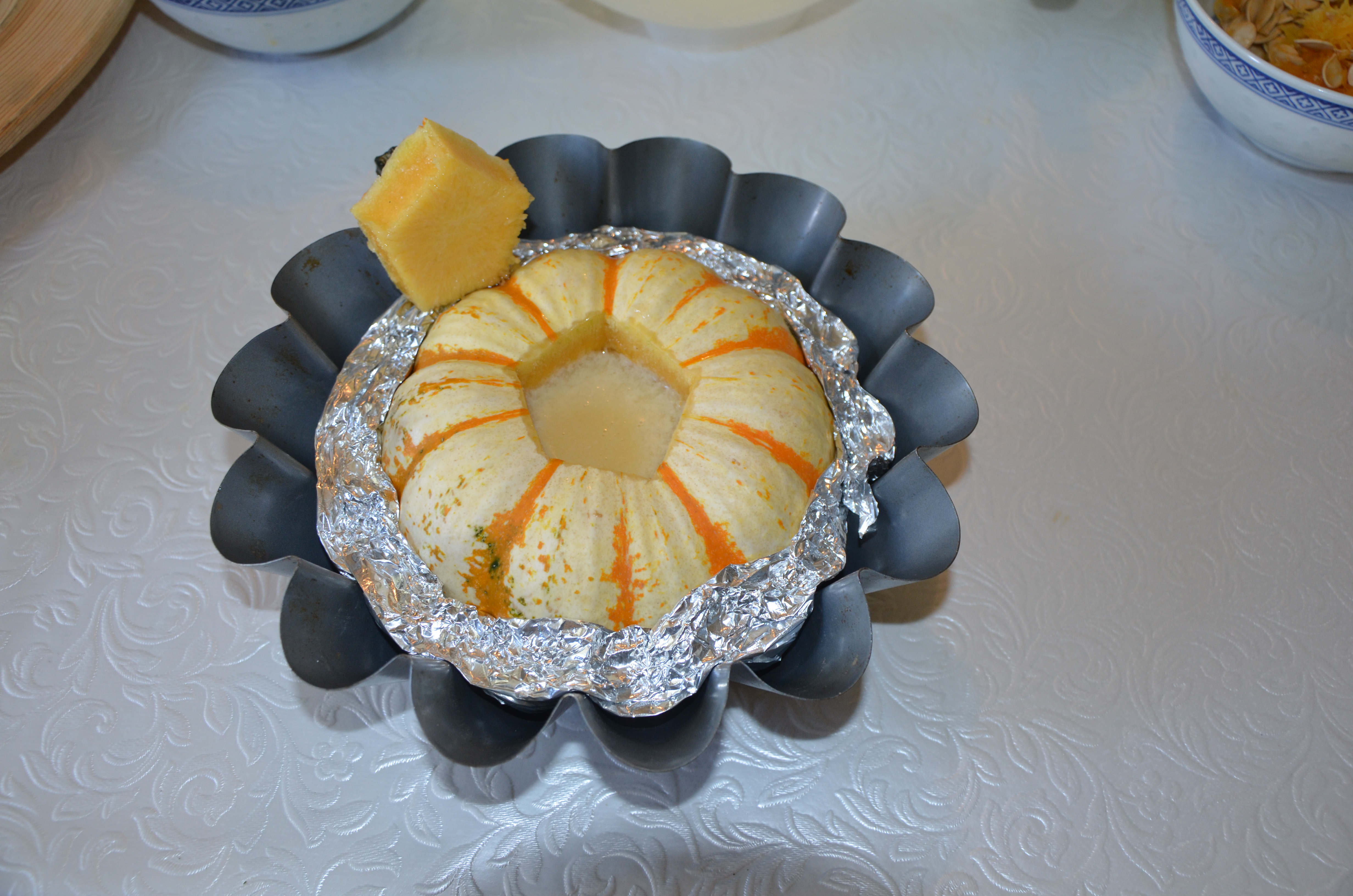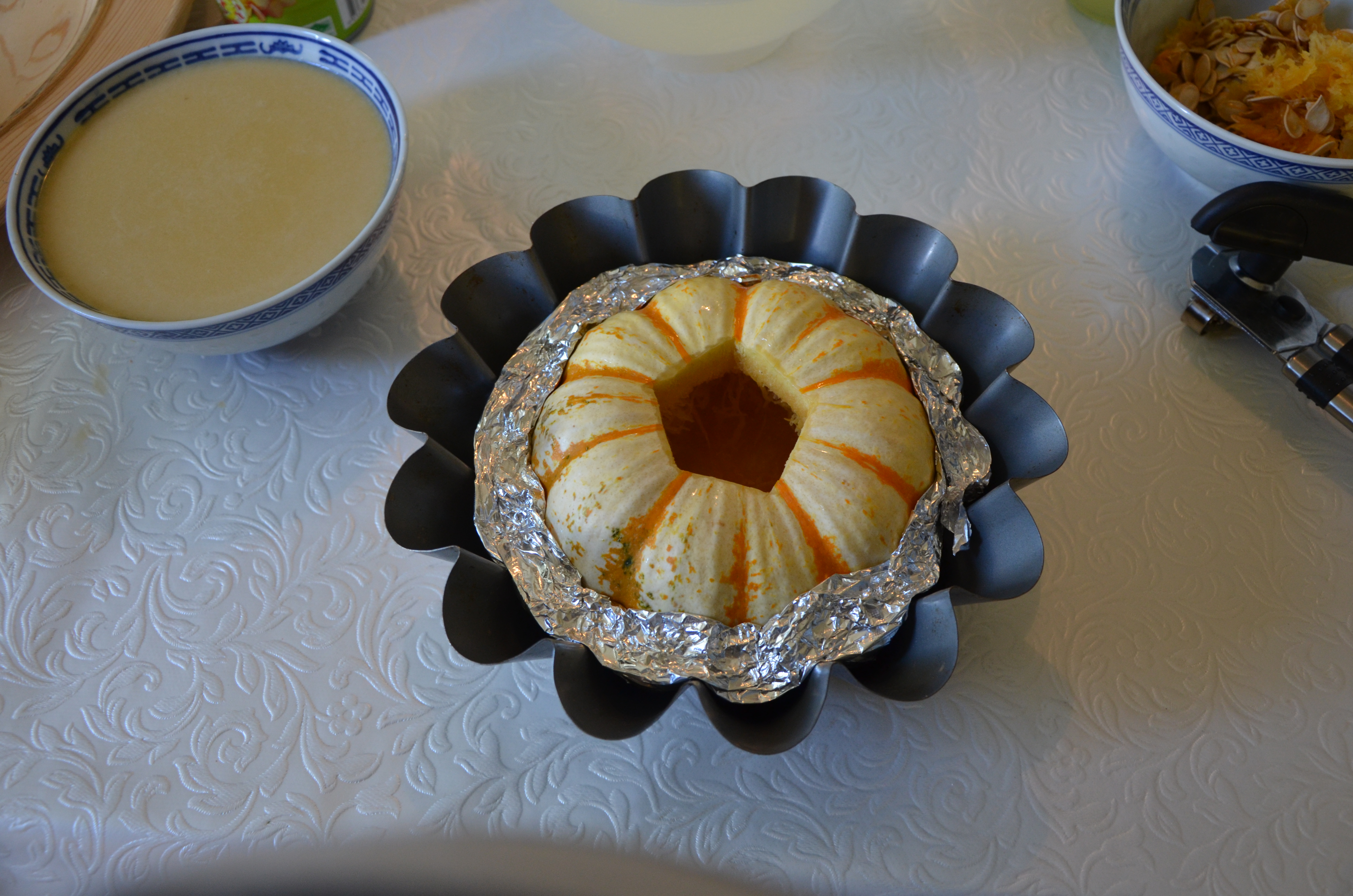 Pour the custard into your hollowed out pumpkin, just to the bottom of the circular opening. Place the filled pumpkin in a bowl or tin and if the tin is wider, add some foil around the pumpkin to give it support all around. You don´t want the pumpkin to break as you steam it.