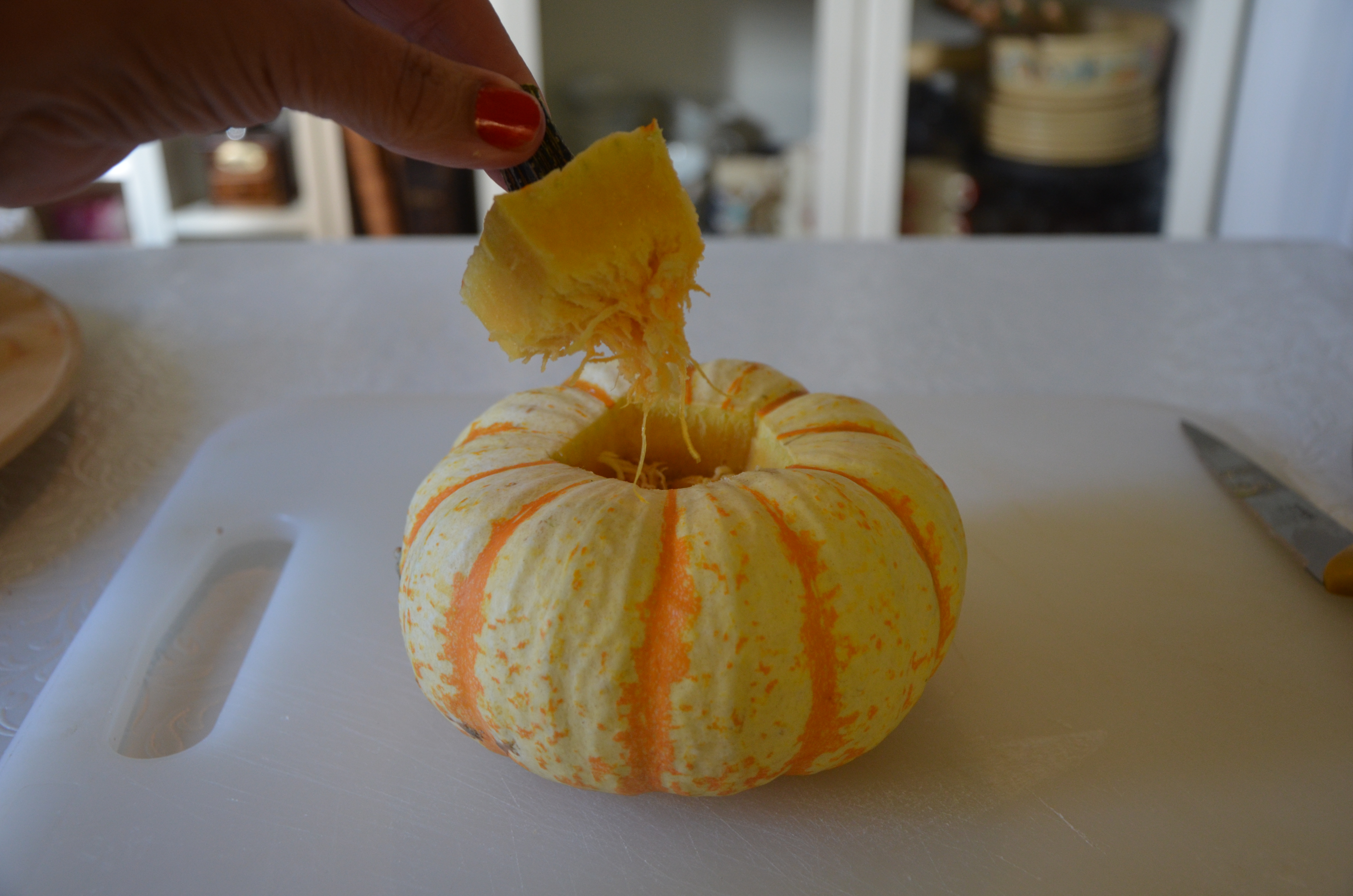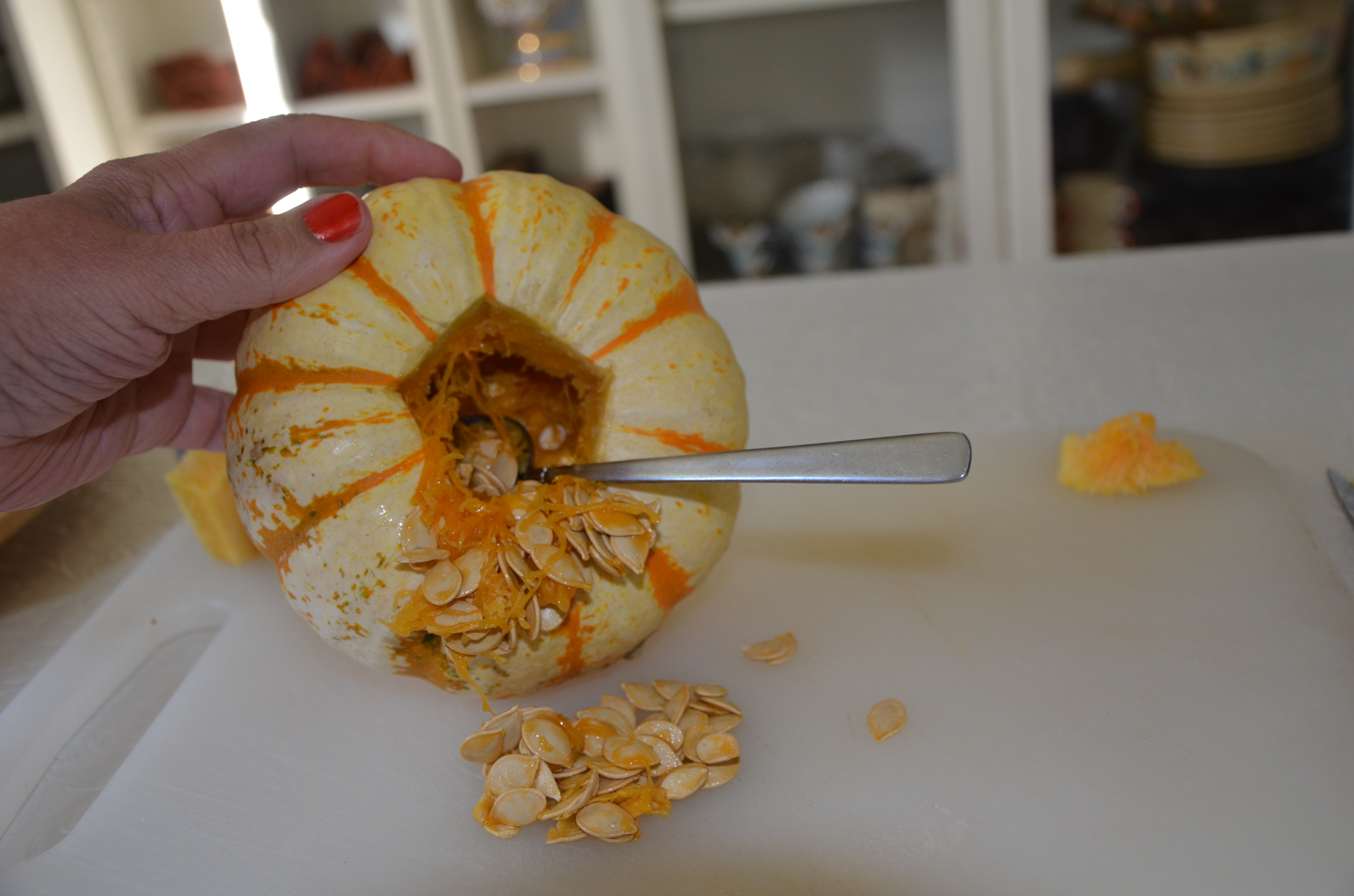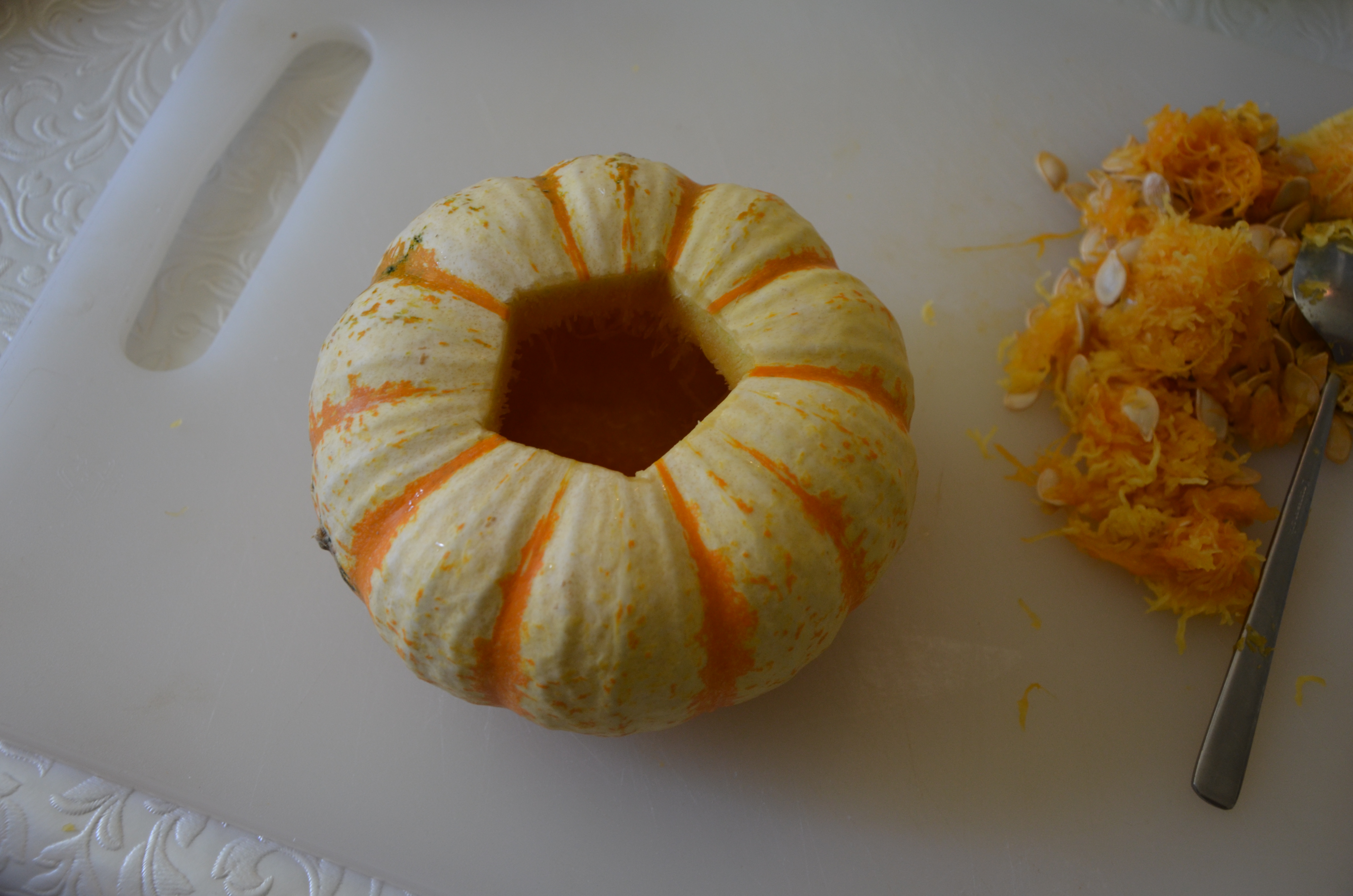 Scoop out all of the pumpkin seeds inside and rinse to ensure it’s clean and smooth inside.