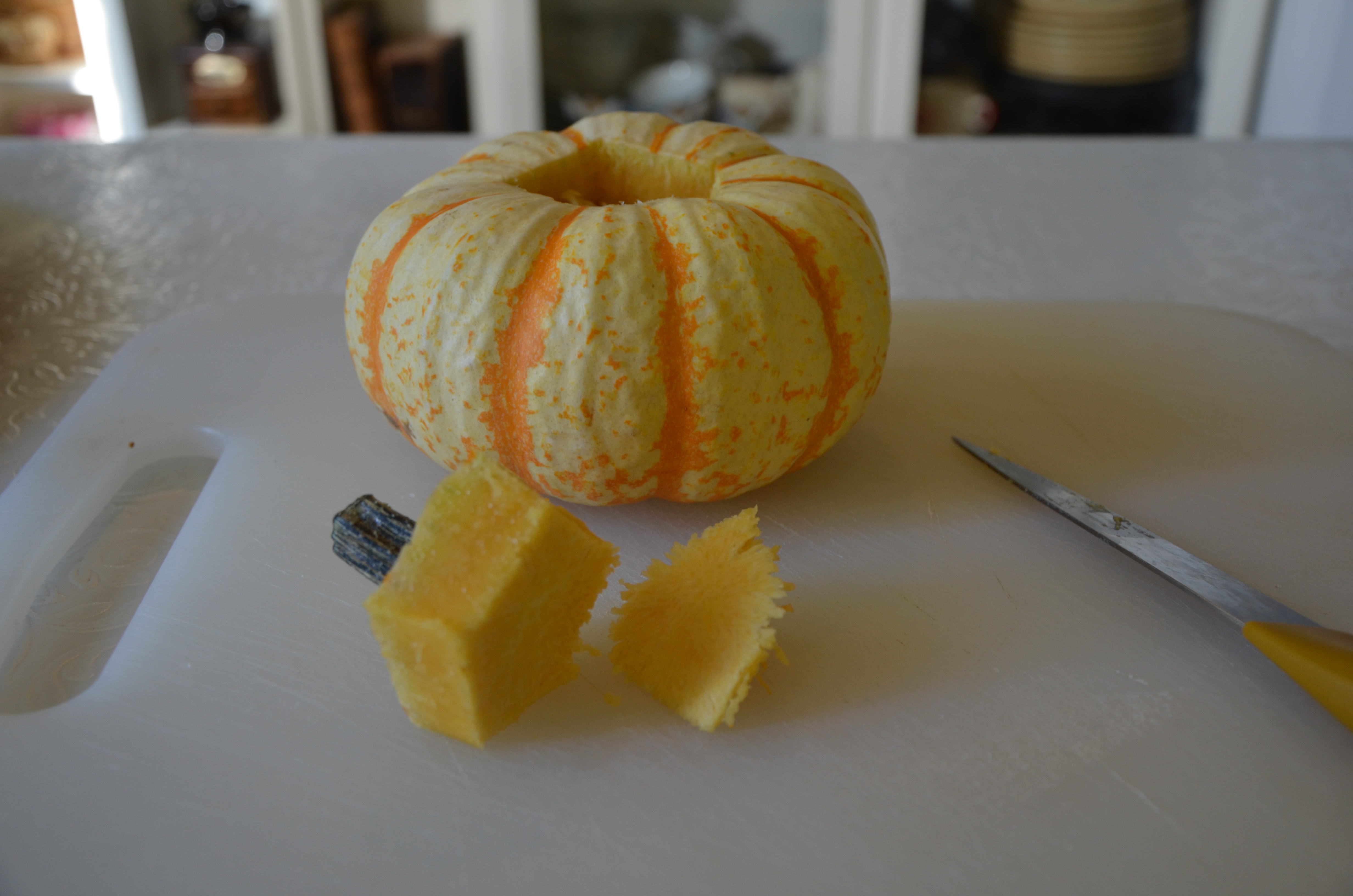Wash your pumpkin thoroughly. Cut a square opening in the top. Use a very sharp knife to cut it out. Pull the square out and cut off the strings.