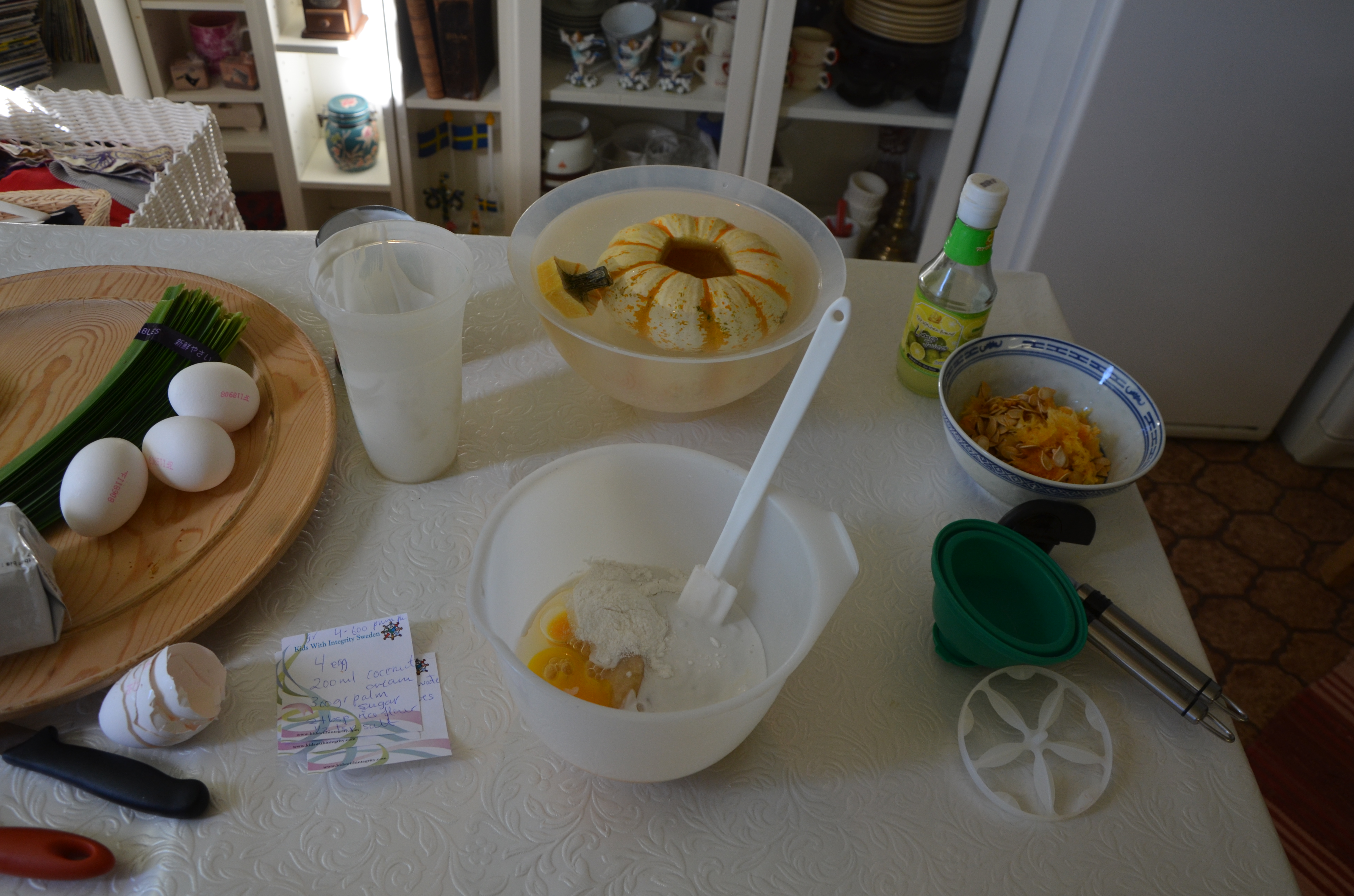 Mix the eggs, palm sugar, coconut milk, rice flour, salt and vanilla extract.