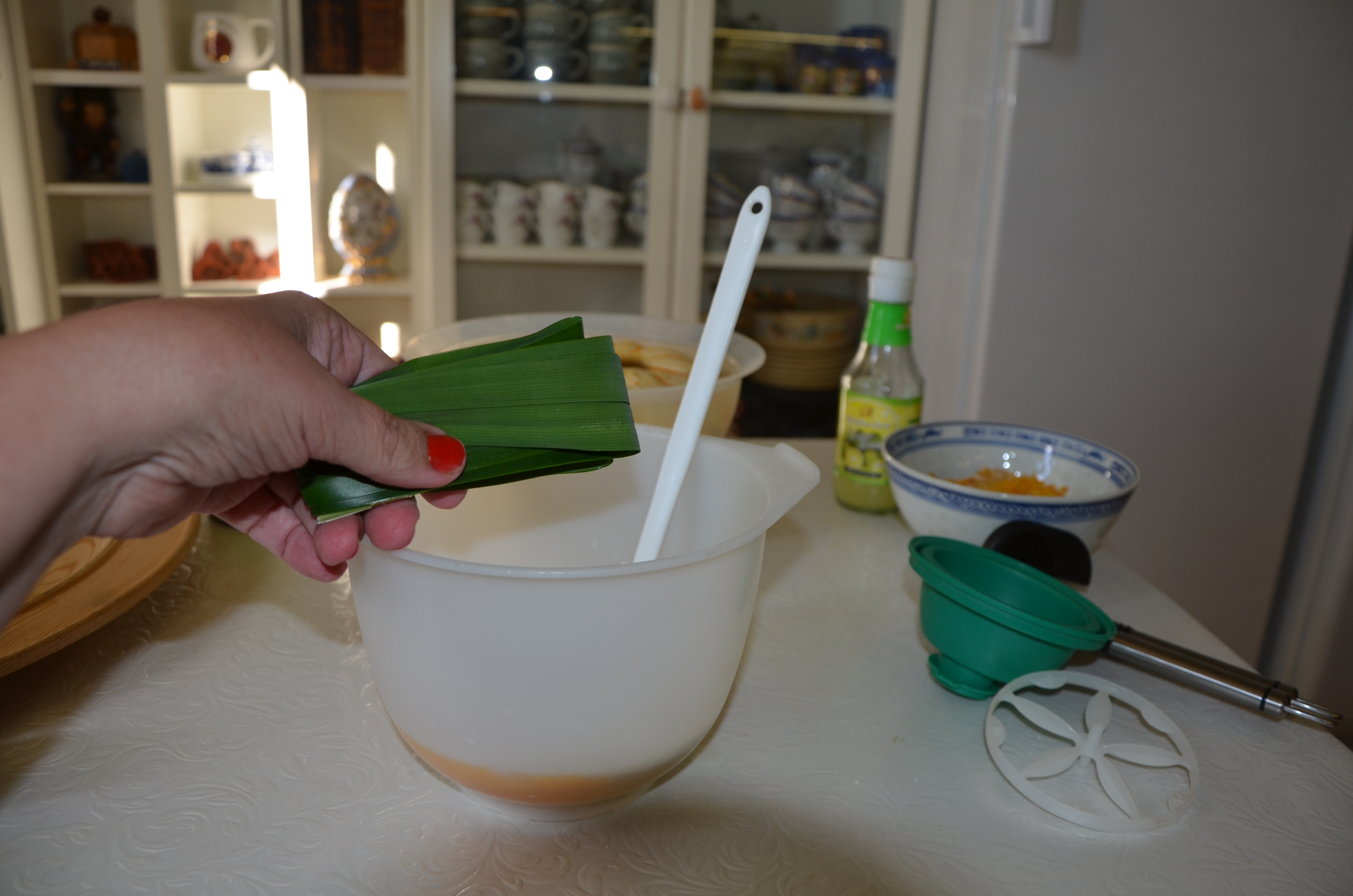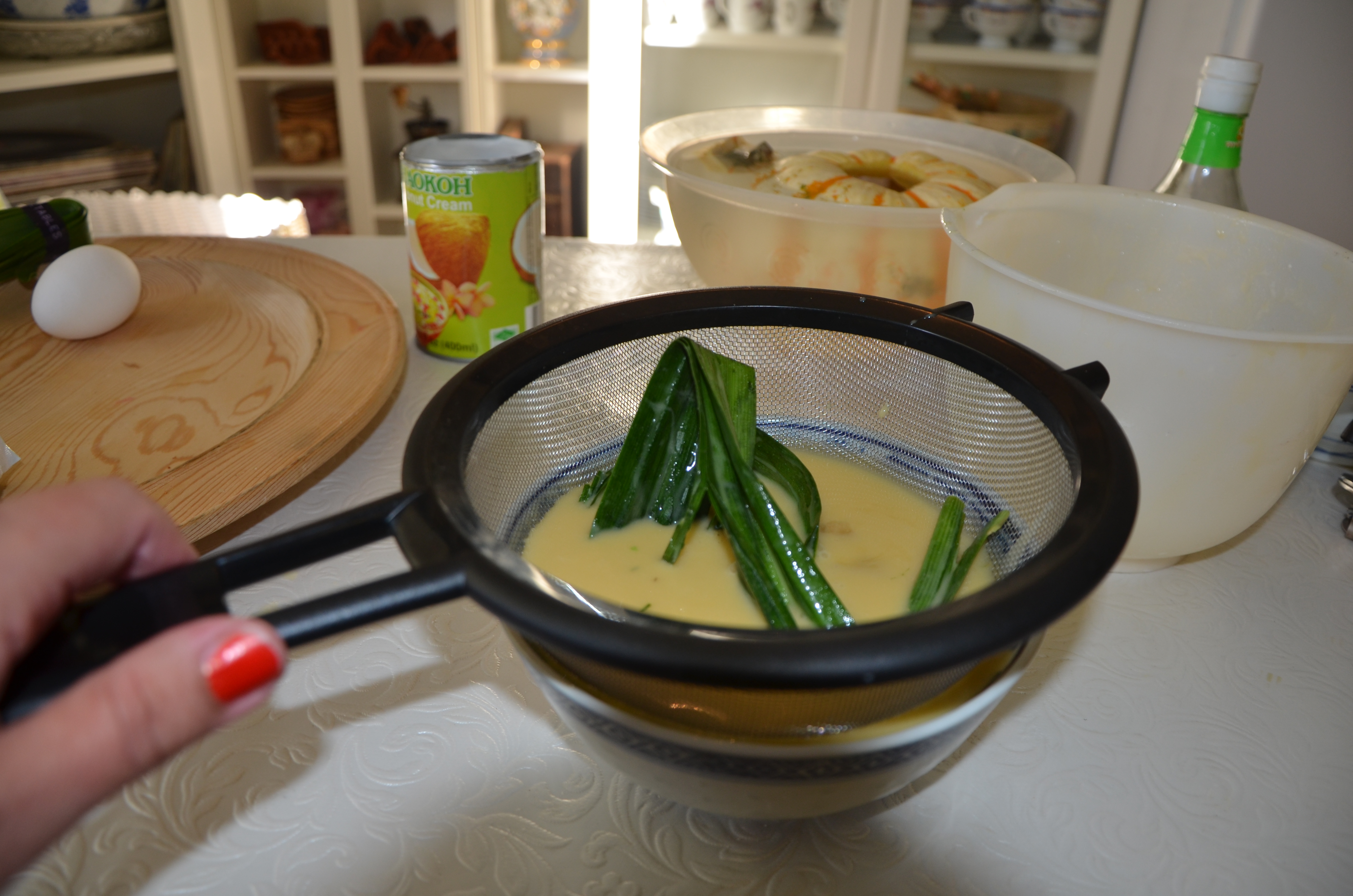 Fold the pandan leaves with your hands and mix the custard mix with your hands, using the pandan leaves to squeeze the mix. Dissolve the palm sugar using your hands and the leaves to squeeze. When all is mixed and sugar dissolved, pour the mix through a sift.