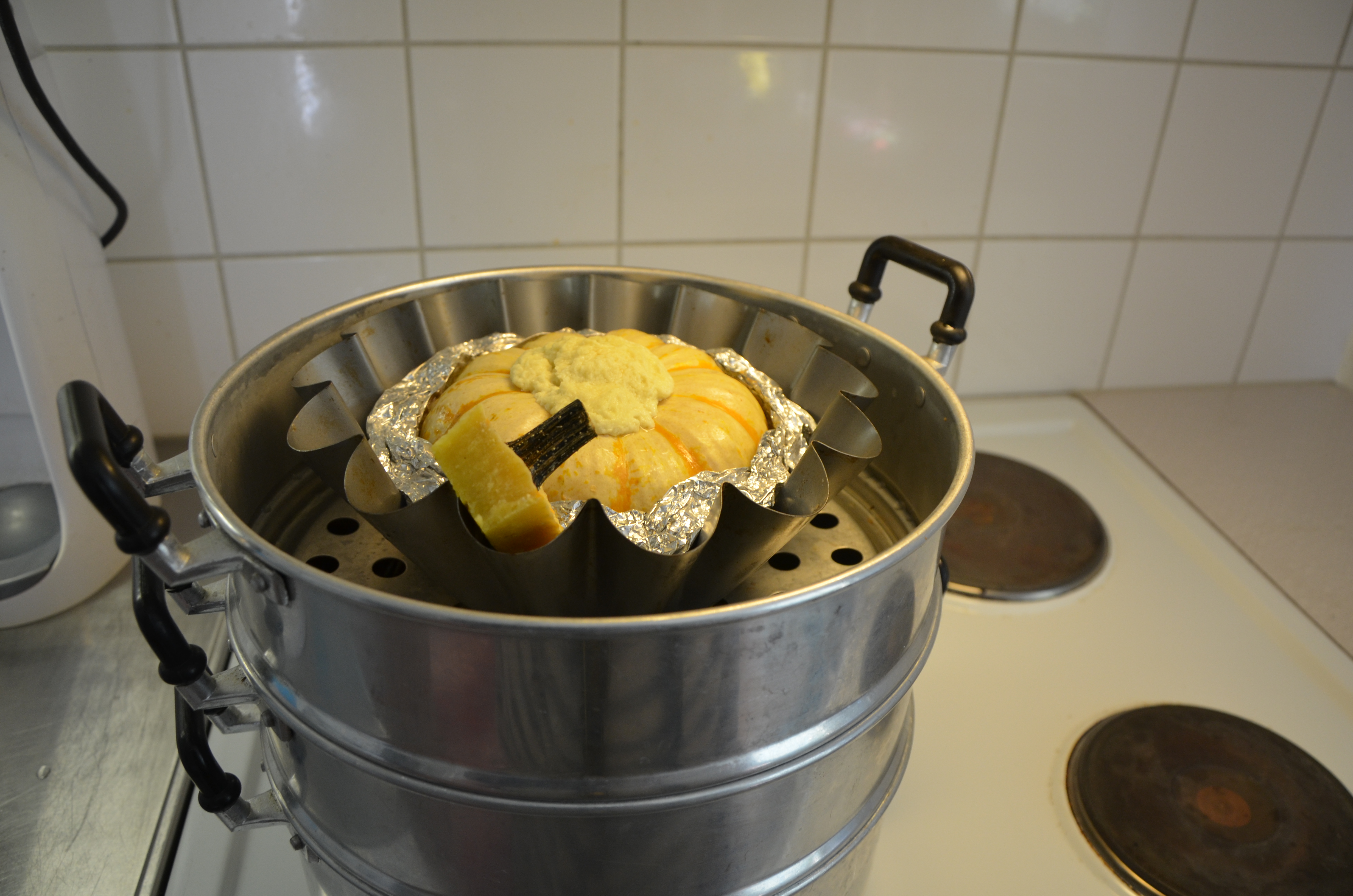 Place in a steamer. Put the lid you cut out on the side. Don´t close the filled pumpkin. Let steam for 45 minutes untouched. Once it’s done, allow to cool a bit before touching.