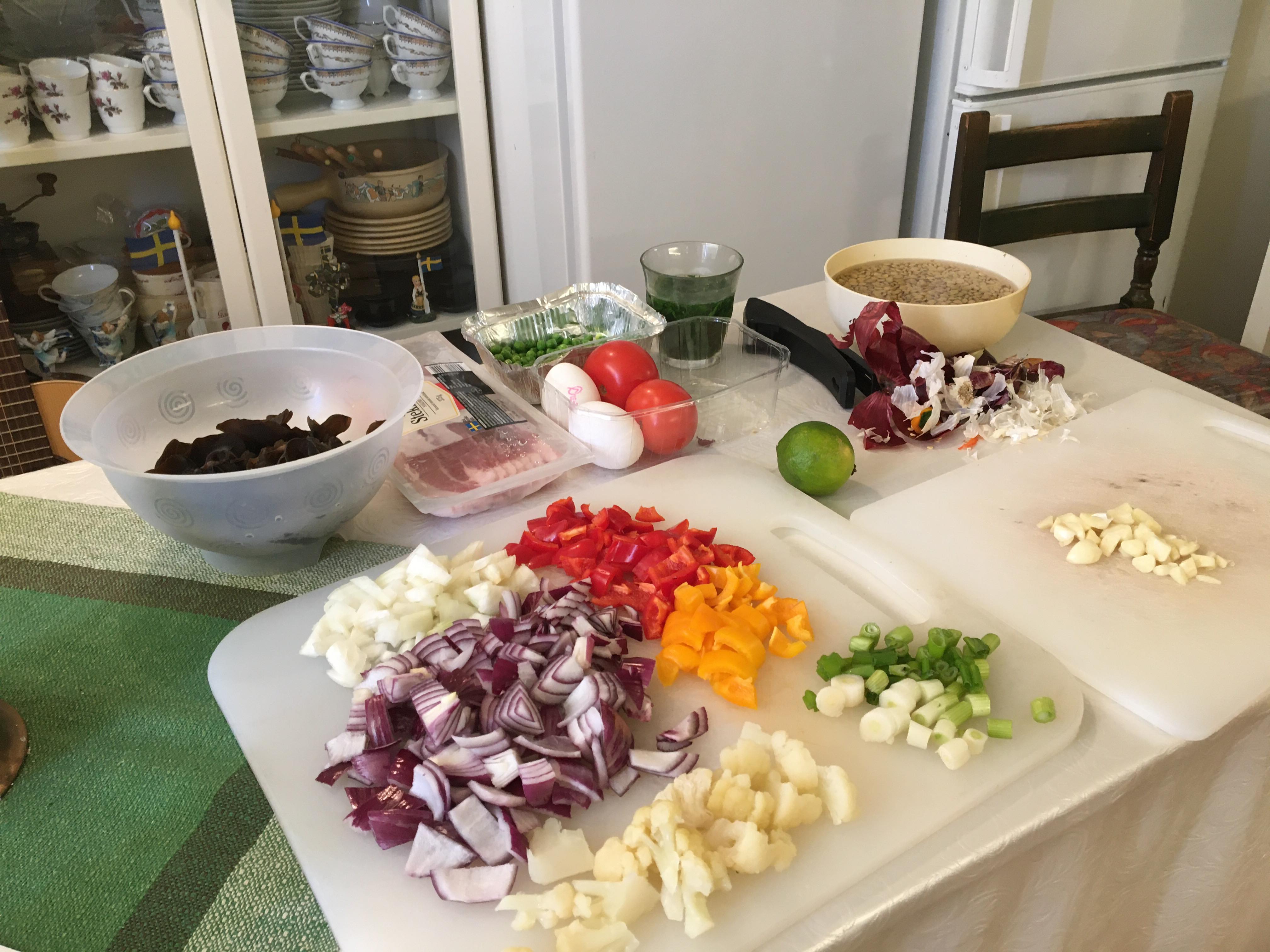 Cookalong with Frida and Ciana. They in Frisco, Dallas Texas, USA and me here in Sollentuna Sweden. This time we made Cod baked in the oven in Coconutmilk. With it we made an Indian inspired Curry with green lentils, chickpeas, leek, carrot, onion and garlic and with indian spicing and coconut milk. I even had white rice with mine. It turned out delicious.